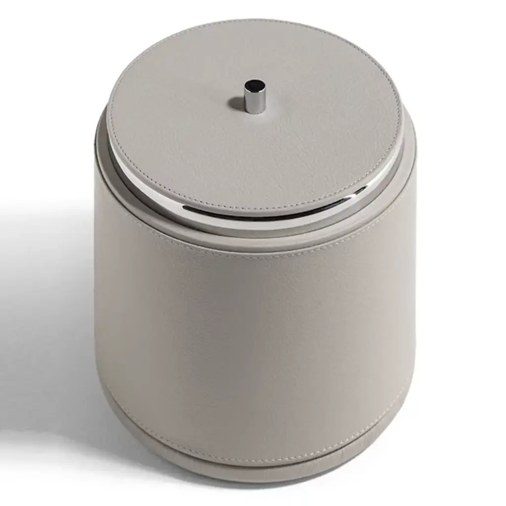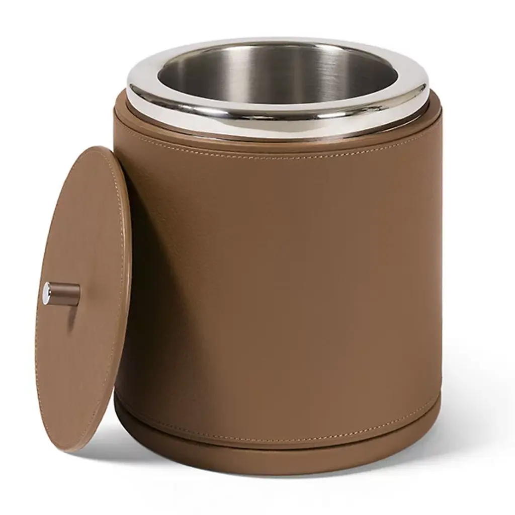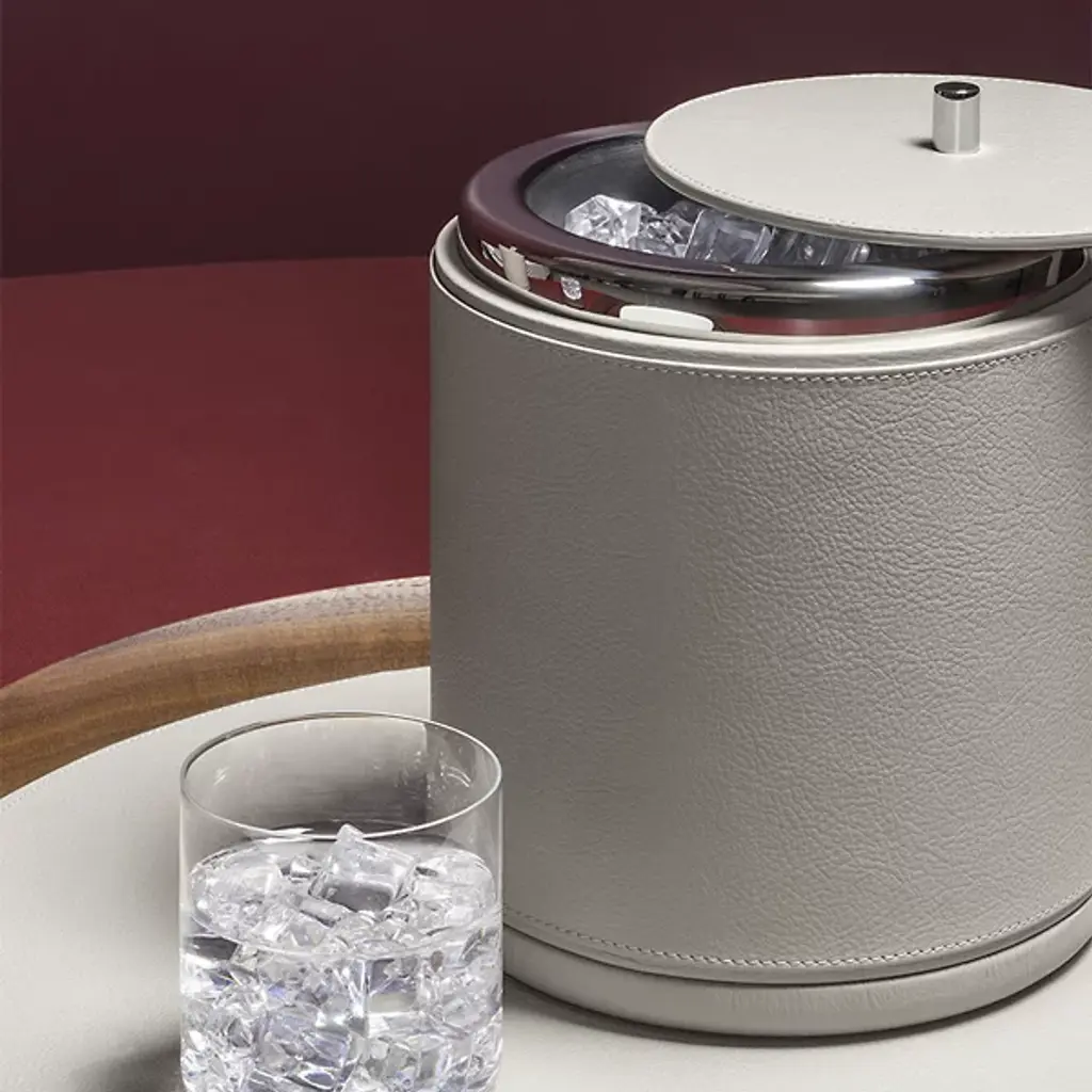 The Poltrona Frau Ice Bucket from Poltrona Frau brings understated sophistication to everyday entertaining. Designed by Giobagnara x Poltrona, it nods to Mid-Century Modern aesthetics with Italian style. Its soft, cylindrical form is fully wrapped in premium Pelle Frau leather, detailed with precise stitching for a tailored finish. Finally, a small metal knob on top allows for easy access to the interior, where a stainless steel liner keeps the ice chilled and ready to serve.