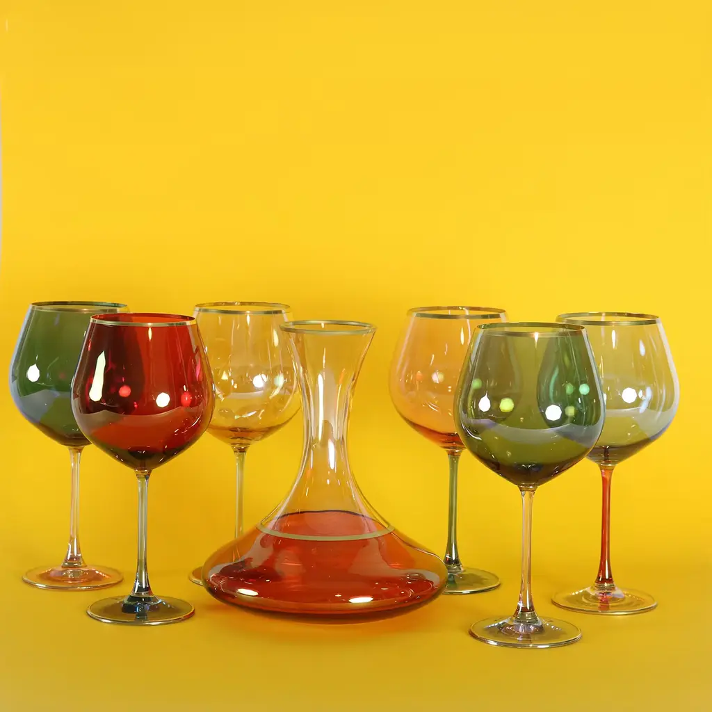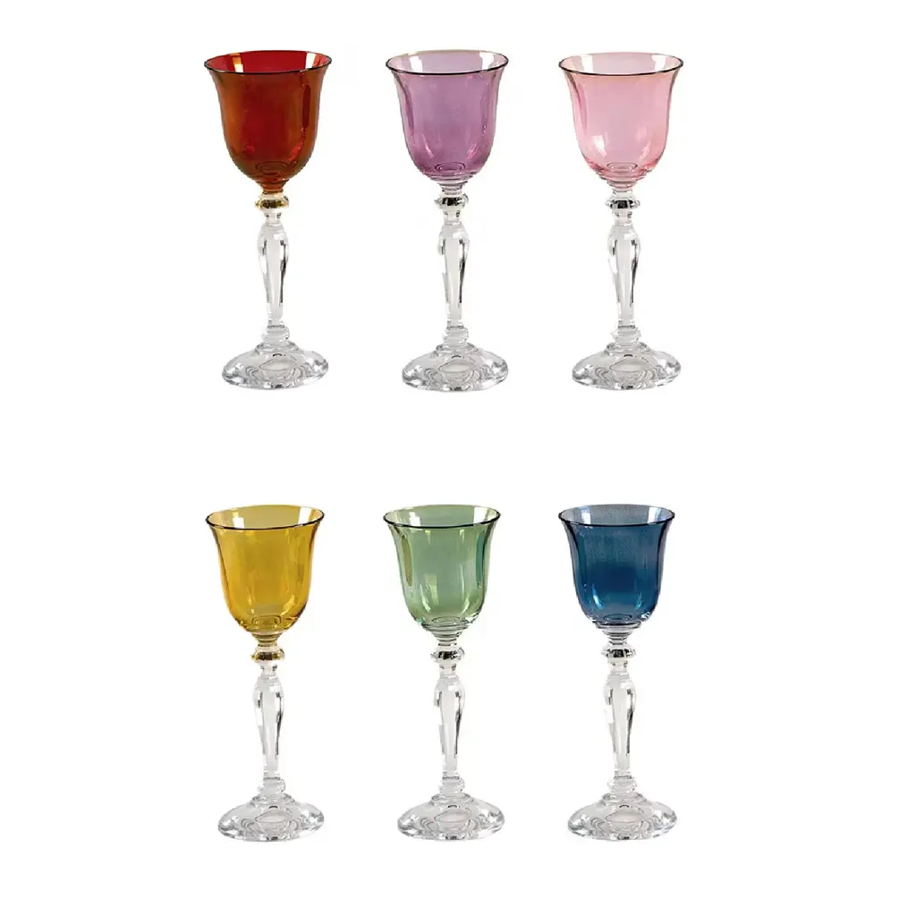 Playful in their daring color assortment as they are classic in their shape, the six wine-tasting glasses composing this set are all carefully handmade of fine glass. Three different hues characterize each piece, a selection resulting from a thoughtful decision that considers chromatic harmony. Also perfect as purely decorative pieces, they are sealed by rims accented in pure gold.
