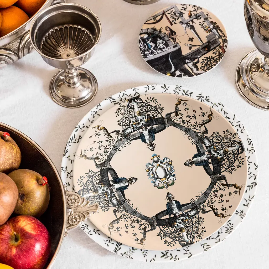 The new Pompei porcelain collection brings back the Grottesche wall decoration in a contemporary key. Ancient designs are taken and declined on the different formats of the mise en place in such a way as to create elegant and unique plays of overlapping. Natural elements, anthropomorphic figures, jewelry and architecture come together to create stories, decorations and geometries. This collection manages to be transversal, adapting to both regal and elegant tables and more formal settings.