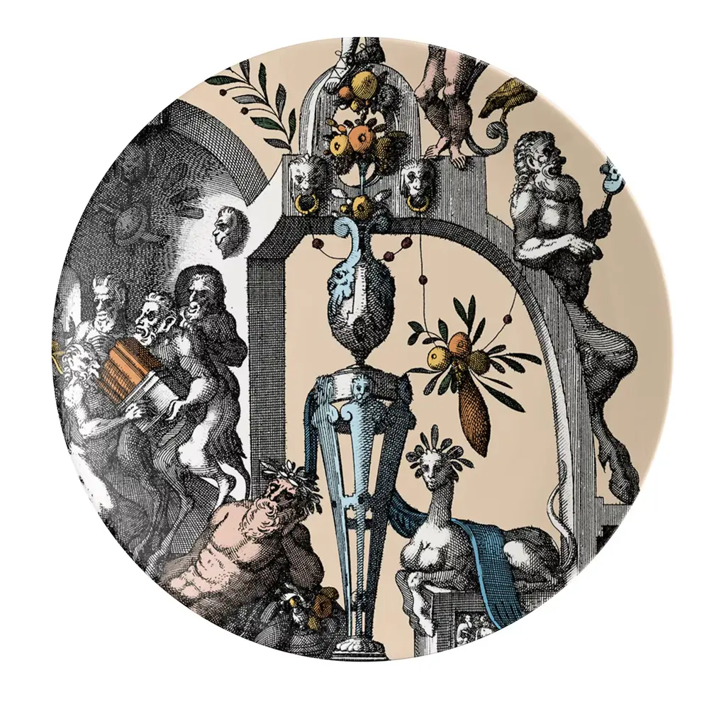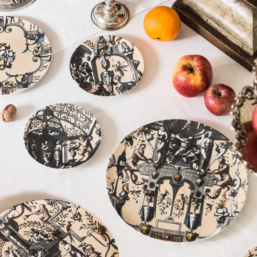 The new Pompei porcelain collection brings back the Grottesche wall decoration in a contemporary key. Ancient designs are taken and declined on the different formats of the mise en place in such a way as to create elegant and unique plays of overlapping. Natural elements, anthropomorphic figures, jewelry and architecture come together to create stories, decorations and geometries. This collection manages to be transversal, adapting to both regal and elegant tables and more formal settings.