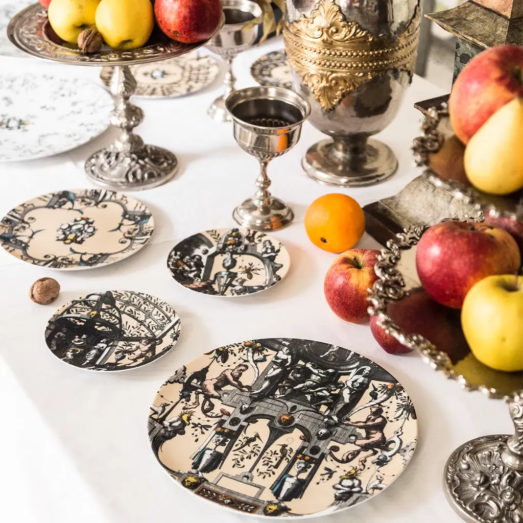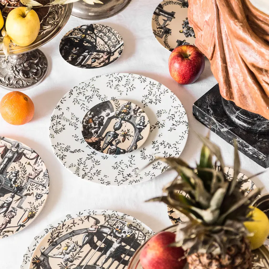The new Pompei porcelain collection brings back the Grottesche wall decoration in a contemporary key. Ancient designs are taken and declined on the different formats of the mise en place in such a way as to create elegant and unique plays of overlapping. Natural elements, anthropomorphic figures, jewelry and architecture come together to create stories, decorations and geometries. This collection manages to be transversal, adapting to both regal and elegant tables and more formal settings.