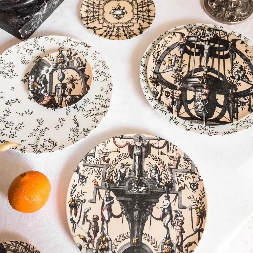 The new Pompei porcelain collection brings back the Grottesche wall decoration in a contemporary key. Ancient designs are taken and declined on the different formats of the mise en place in such a way as to create elegant and unique plays of overlapping. Natural elements, anthropomorphic figures, jewelry and architecture come together to create stories, decorations and geometries. This collection manages to be transversal, adapting to both regal and elegant tables and more formal settings.