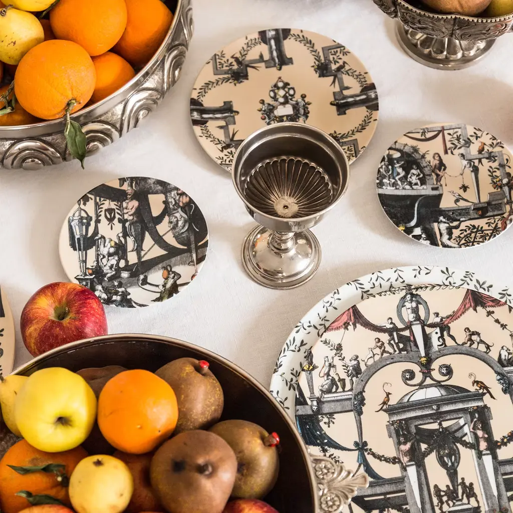 The new Pompei porcelain collection brings back the Grottesche wall decoration in a contemporary key. Ancient designs are taken and declined on the different formats of the mise en place in such a way as to create elegant and unique plays of overlapping. Natural elements, anthropomorphic figures, jewelry and architecture come together to create stories, decorations and geometries. This collection manages to be transversal, adapting to both regal and elegant tables and more formal settings.