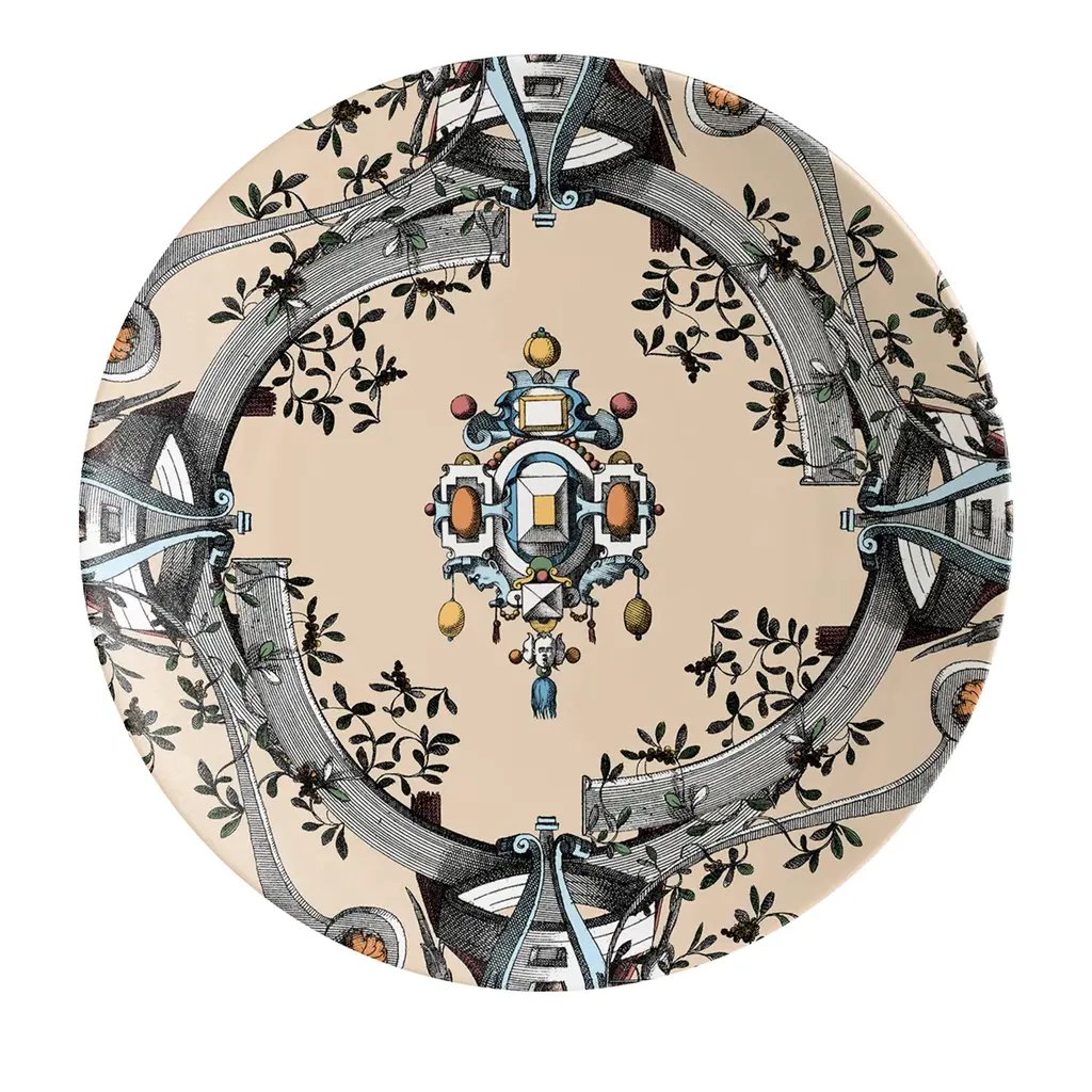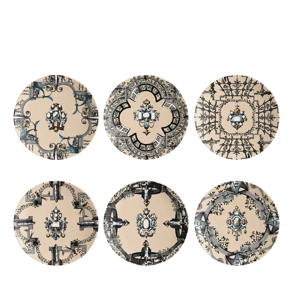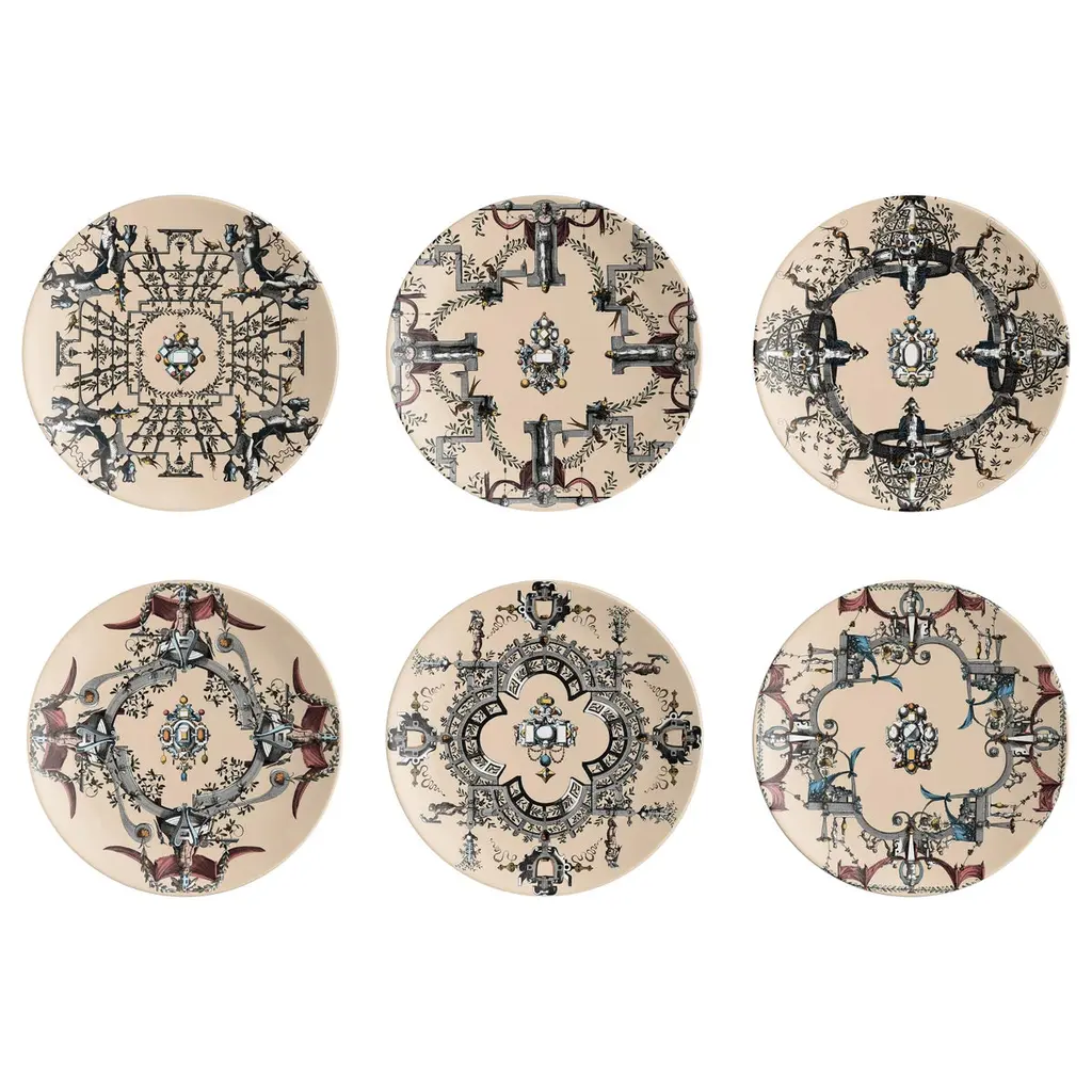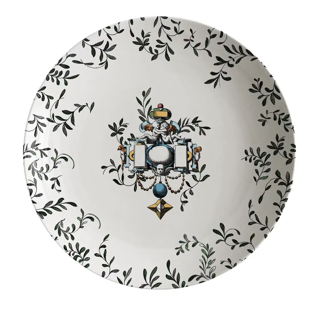 The new Pompei porcelain collection brings back the Grottesche wall decoration in a contemporary key. Ancient designs are taken and declined on the different formats of the mise en place in such a way as to create elegant and unique plays of overlapping. Natural elements, anthropomorphic figures, jewelry and architecture come together to create stories, decorations and geometries. This collection manages to be transversal, adapting to both regal and elegant tables and more formal settings.