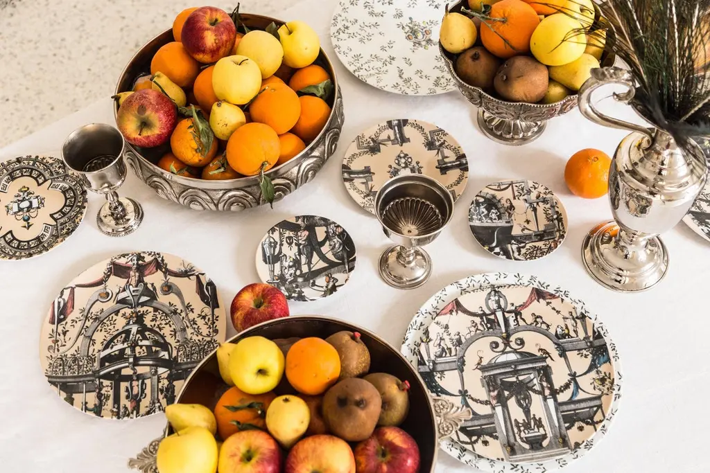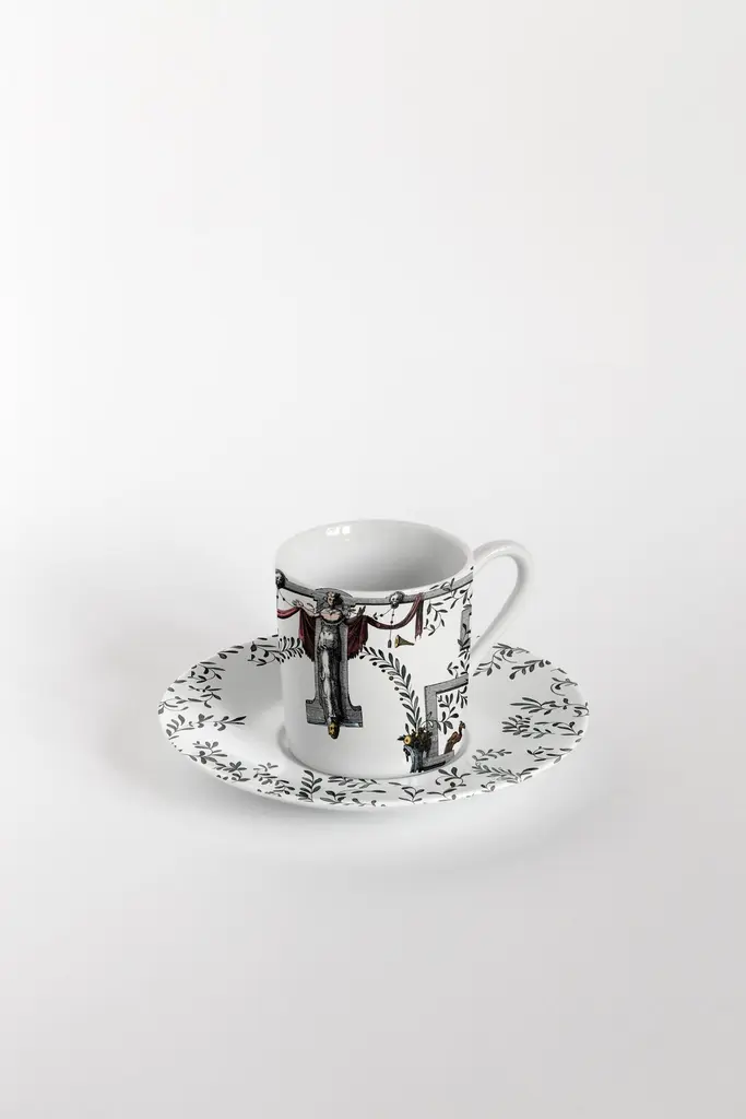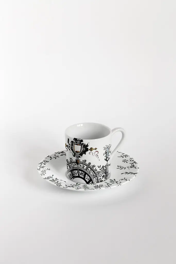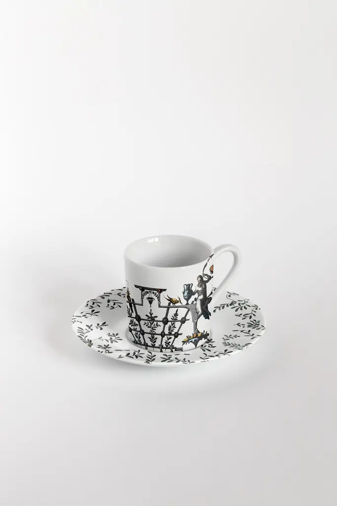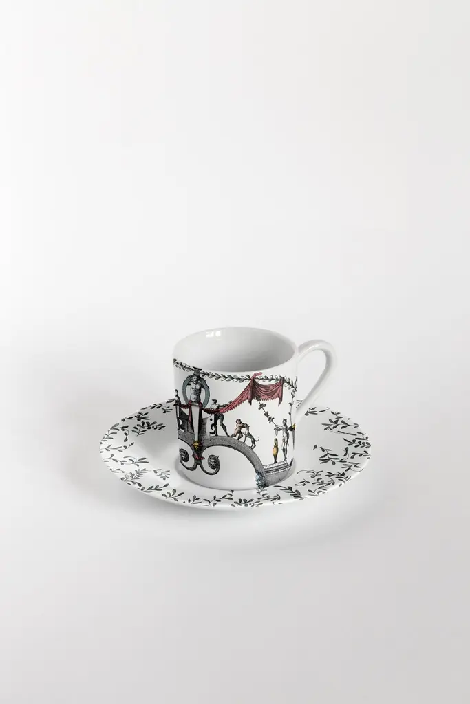 The porcelain collection Pompei by Grand Tour By Vito Nesta brings the Grottesche wall decoration back to life in a contemporary key. Ancient designs are taken and declined on the different formats of the mise en place in such a way as to create elegant and unique plays of overlapping. Natural elements, anthropomorphic figures, jewellery and architecture come together to create stories, decorations and geometries that fill the eye and intrigue the mind. This collection manages to be transversal, adapting both to regal and elegant tables and to more formal settings, elevating them with flair.Set of 6 coffee cups with plates.