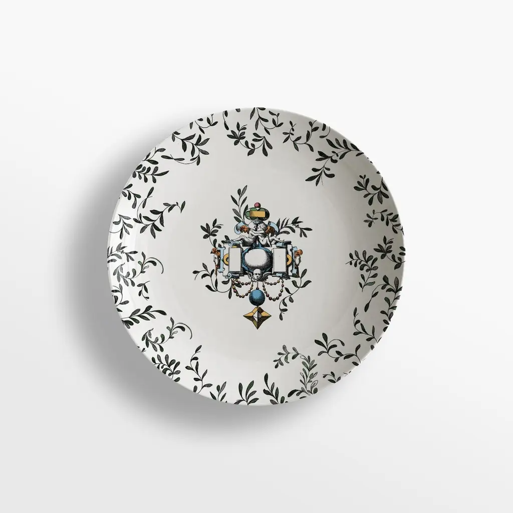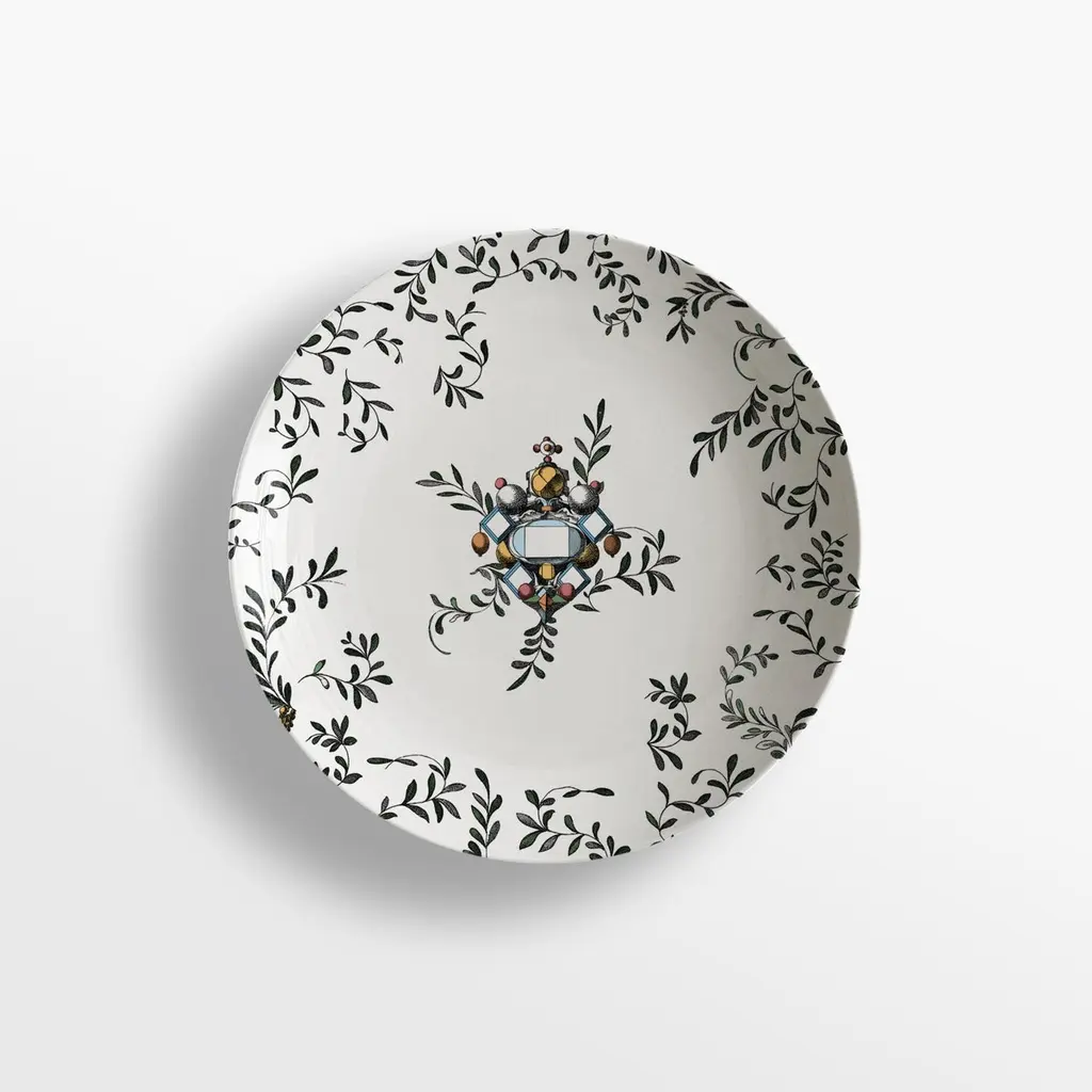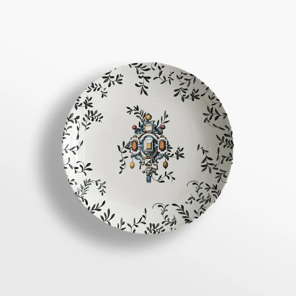The porcelain collection Pompei by Grand Tour By Vito Nesta brings the Grottesche wall decoration back to life in a contemporary key. Ancient designs are taken and declined on the different formats of the mise en place in such a way as to create elegant and unique plays of overlapping. Natural elements, anthropomorphic figures, jewellery and architecture come together to create stories, decorations and geometries that fill the eye and intrigue the mind. This collection manages to be transversal, adapting both to regal and elegant tables and to more formal settings, elevating them with flair.Set of 6 soup plates.
