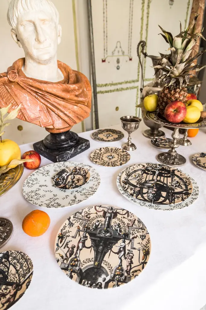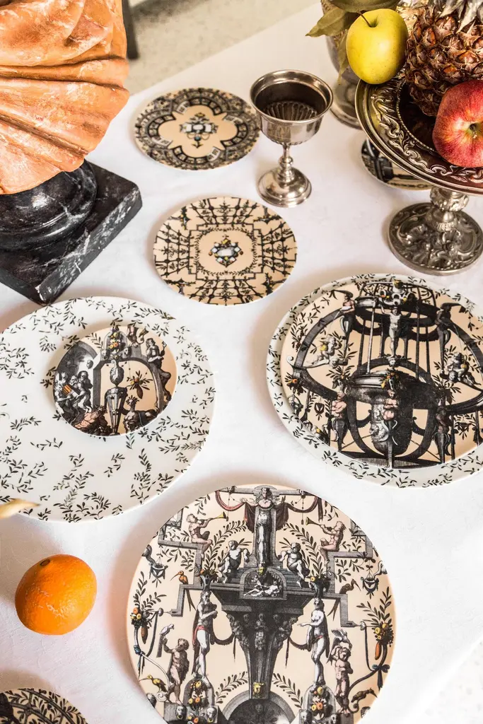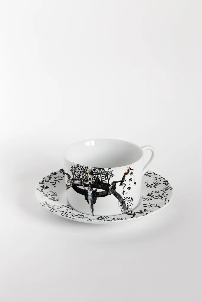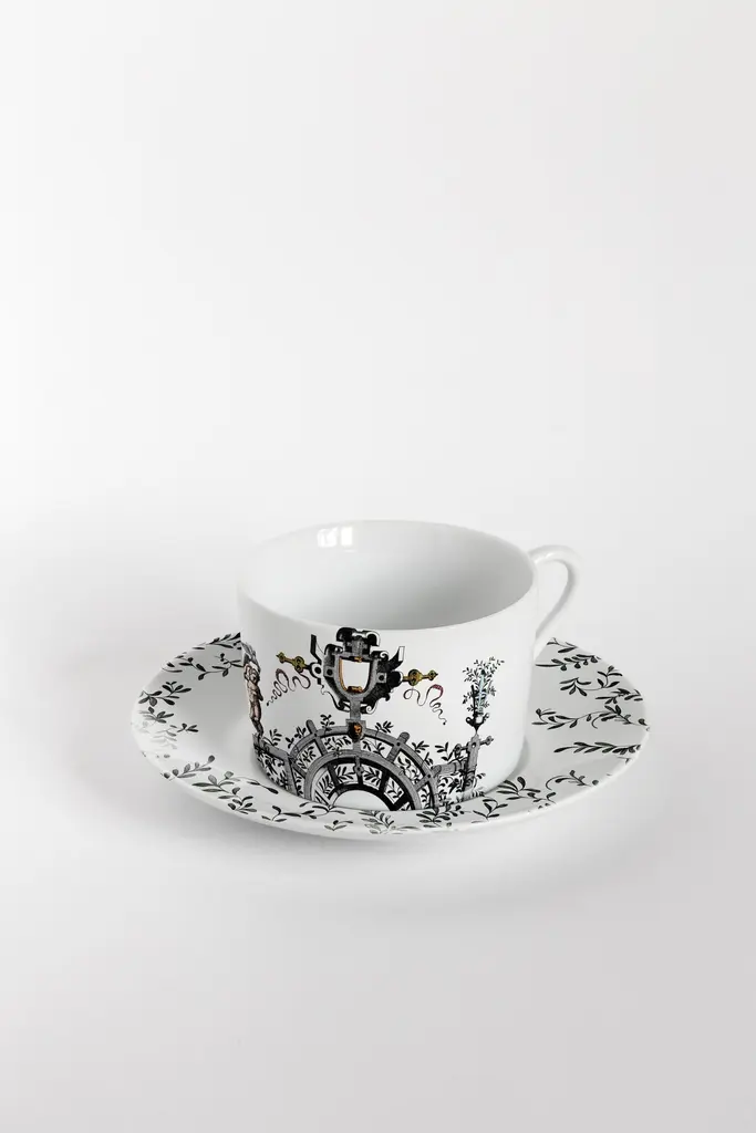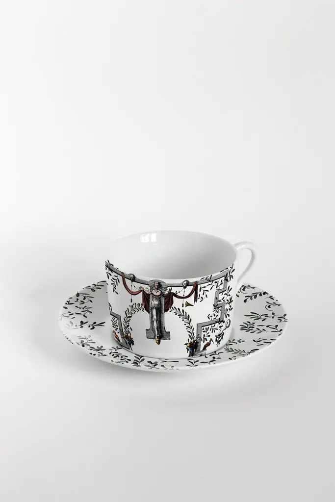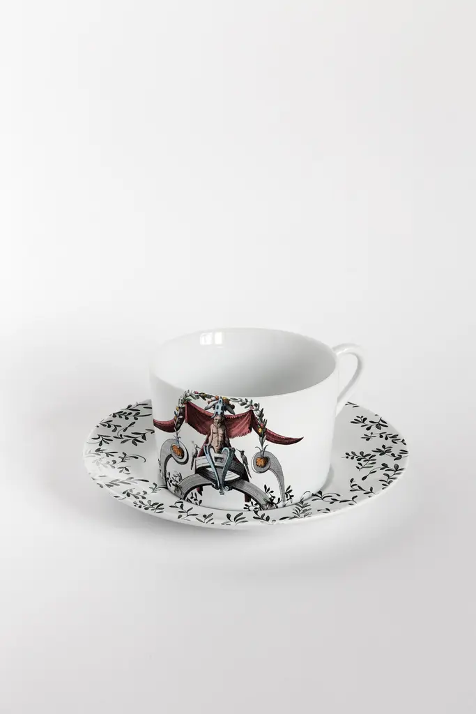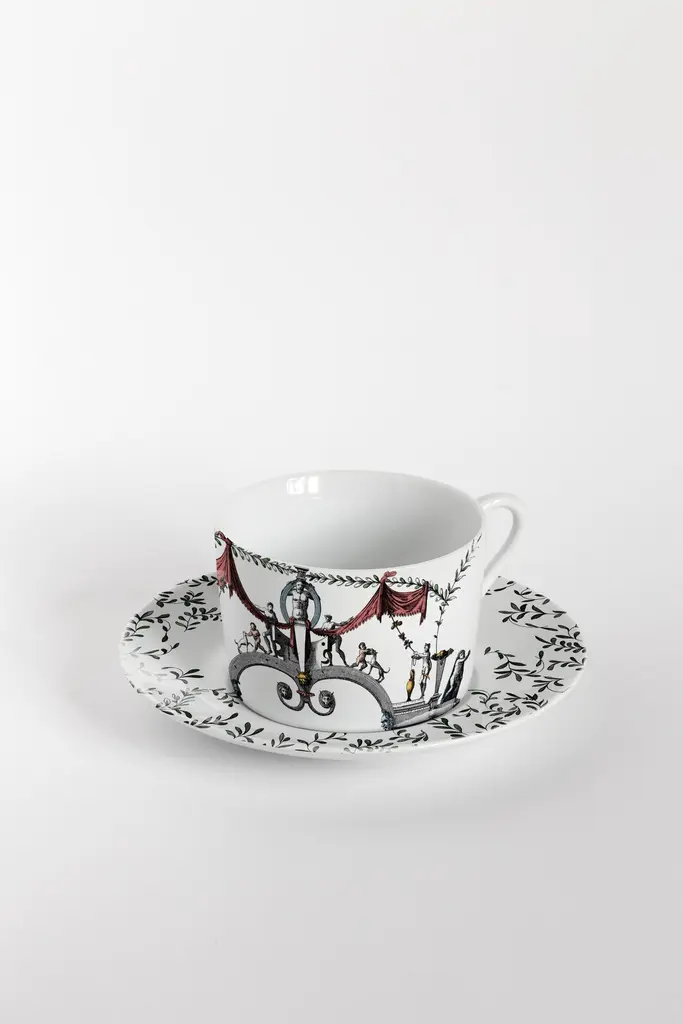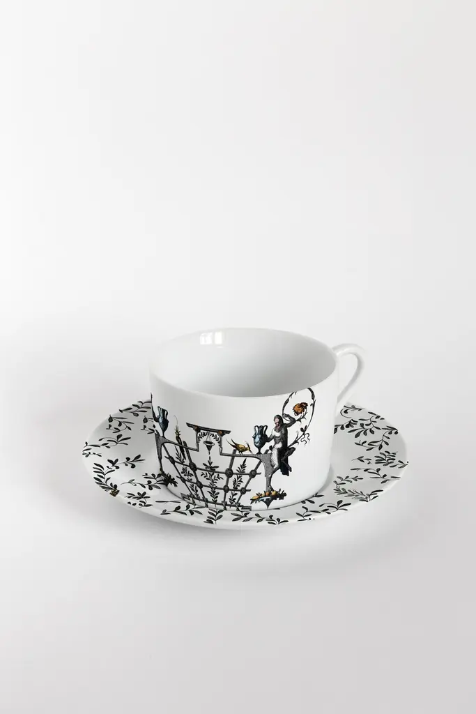 The porcelain collection Pompei by Grand Tour By Vito Nesta brings the Grottesche wall decoration back to life in a contemporary key. Ancient designs are taken and declined on the different formats of the mise en place in such a way as to create elegant and unique plays of overlapping. Natural elements, anthropomorphic figures, jewellery and architecture come together to create stories, decorations and geometries that fill the eye and intrigue the mind. This collection manages to be transversal, adapting both to regal and elegant tables and to more formal settings, elevating them with flair.Set of 6 tea cups with plate.