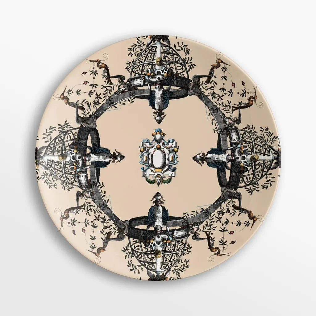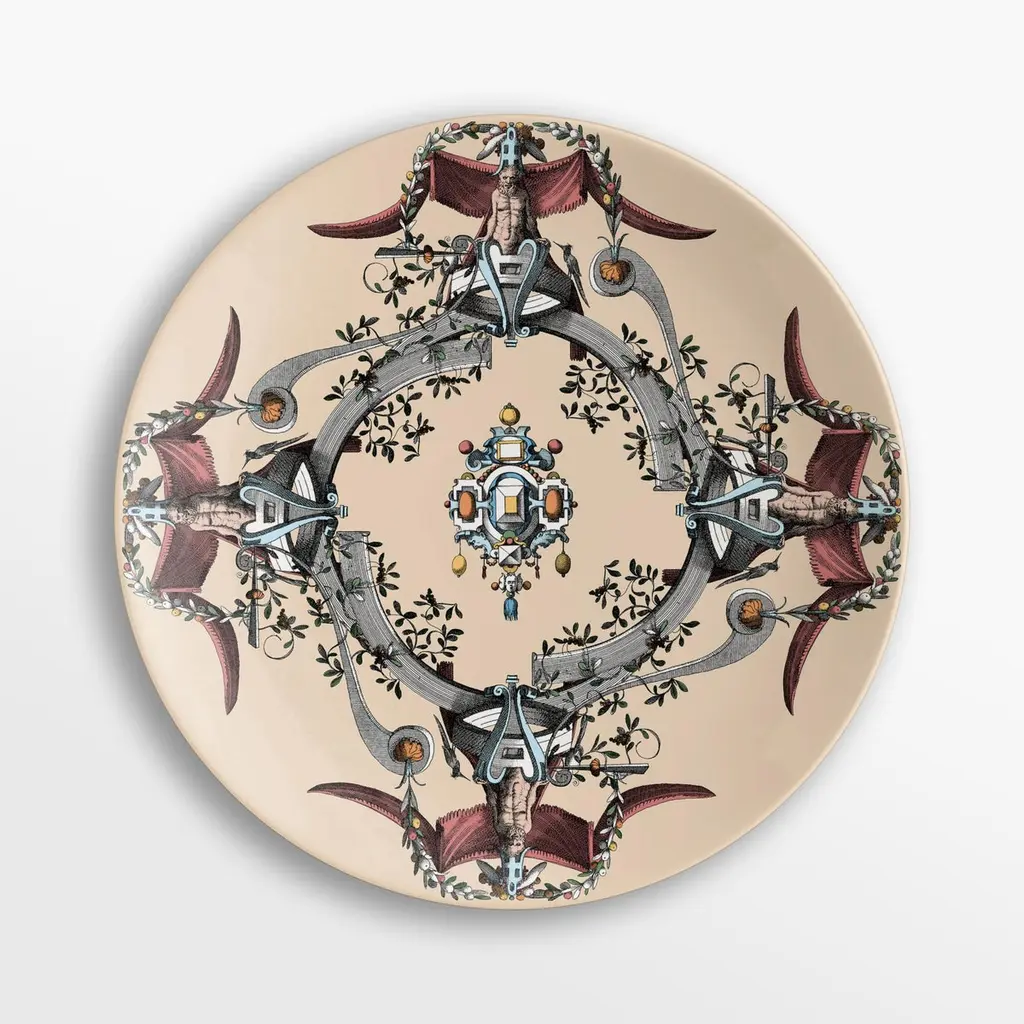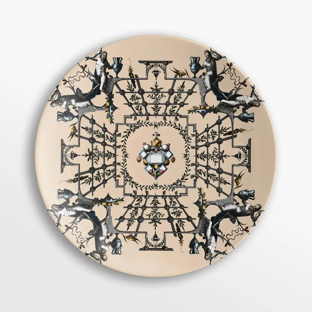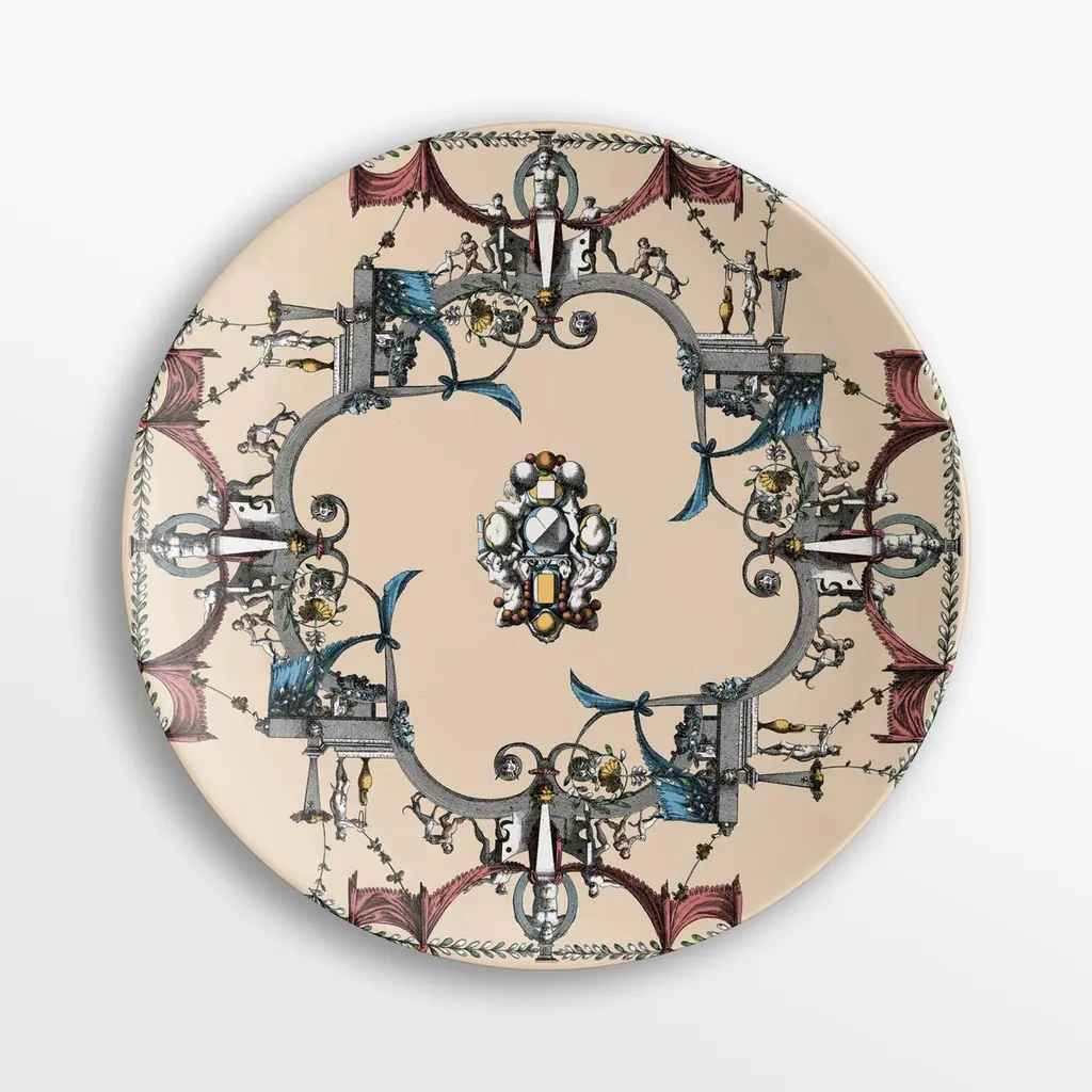 The porcelain collection Pompei by Grand Tour By Vito Nesta brings the Grottesche wall decoration back to life in a contemporary key. Ancient designs are taken and declined on the different formats of the mise en place in such a way as to create elegant and unique plays of overlapping. Natural elements, anthropomorphic figures, jewellery and architecture come together to create stories, decorations and geometries that fill the eye and intrigue the mind. This collection manages to be transversal, adapting both to regal and elegant tables and to more formal settings, elevating them with flair.Set of 6 dinner plates.