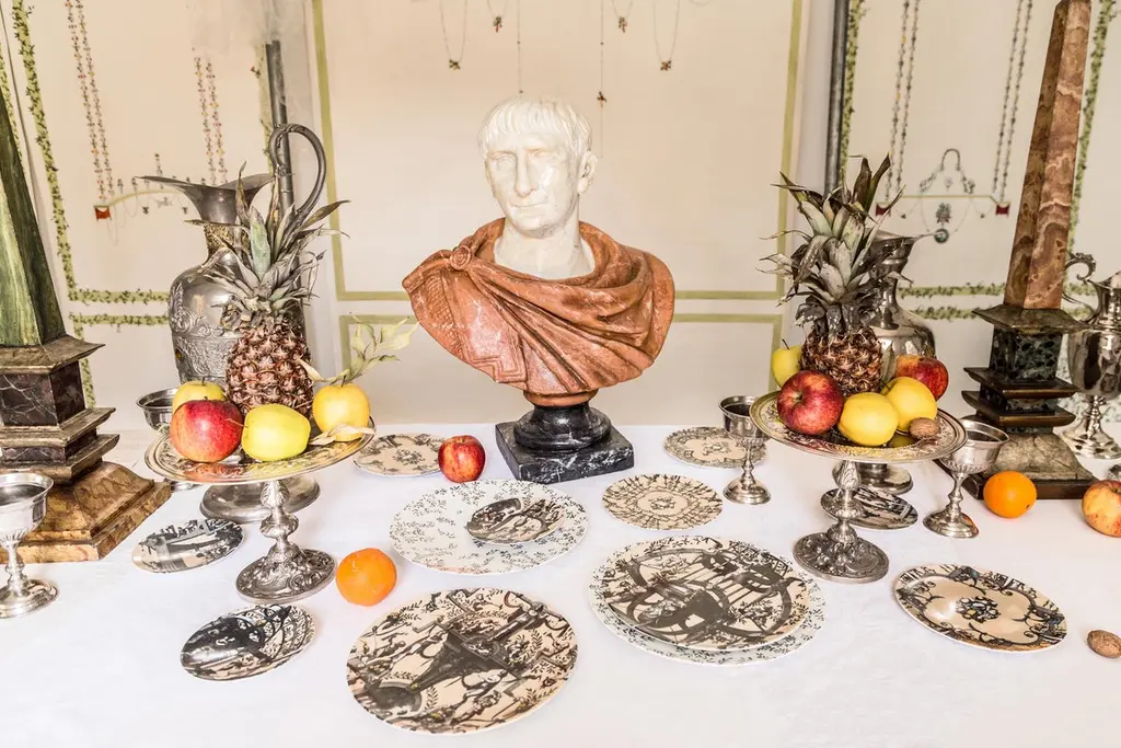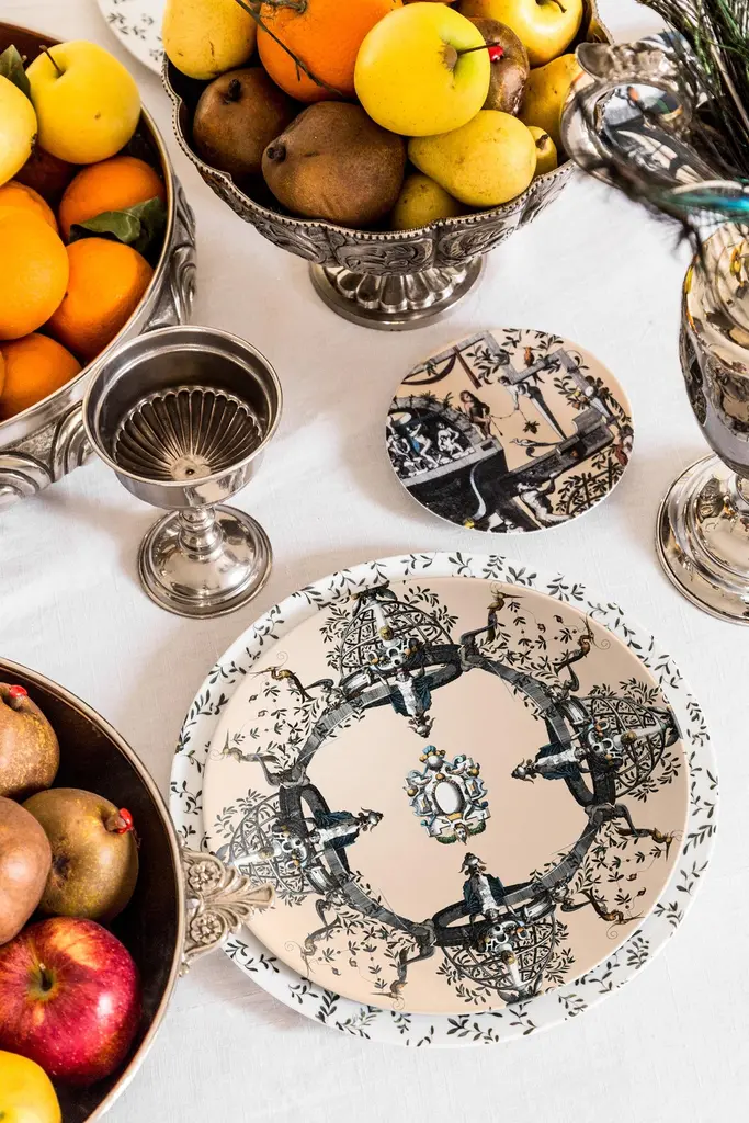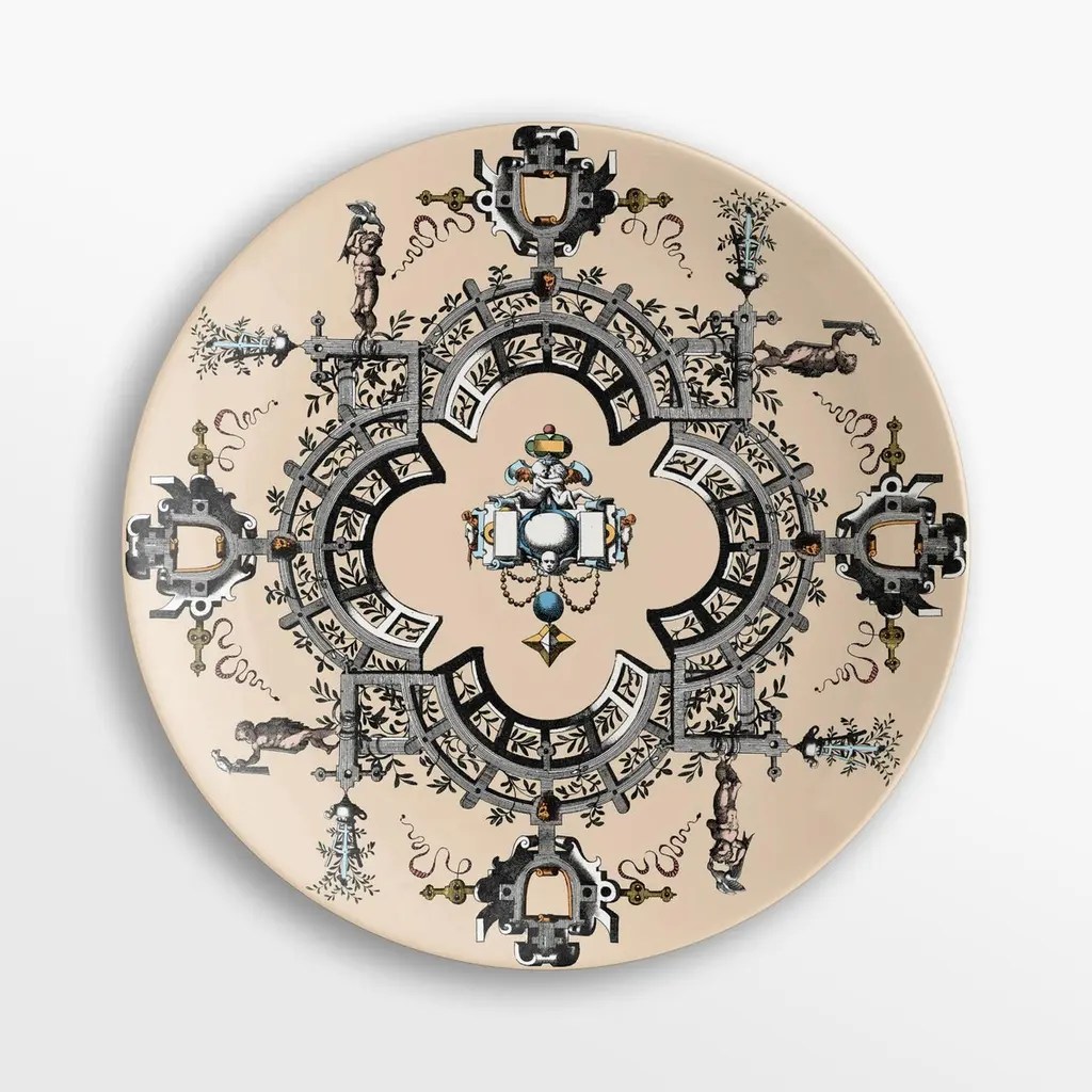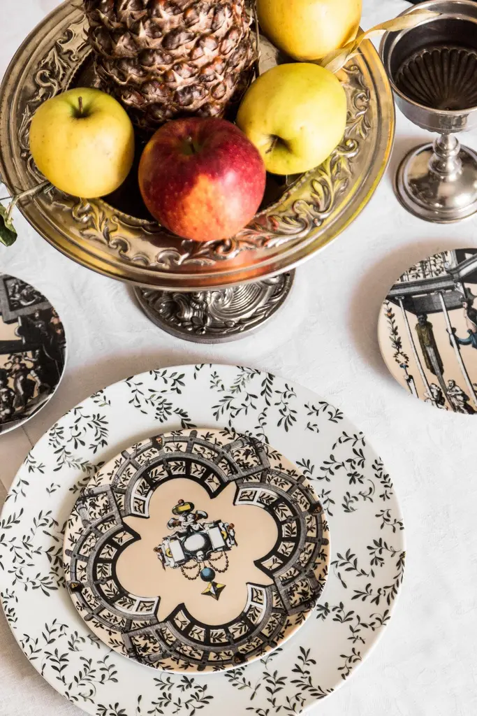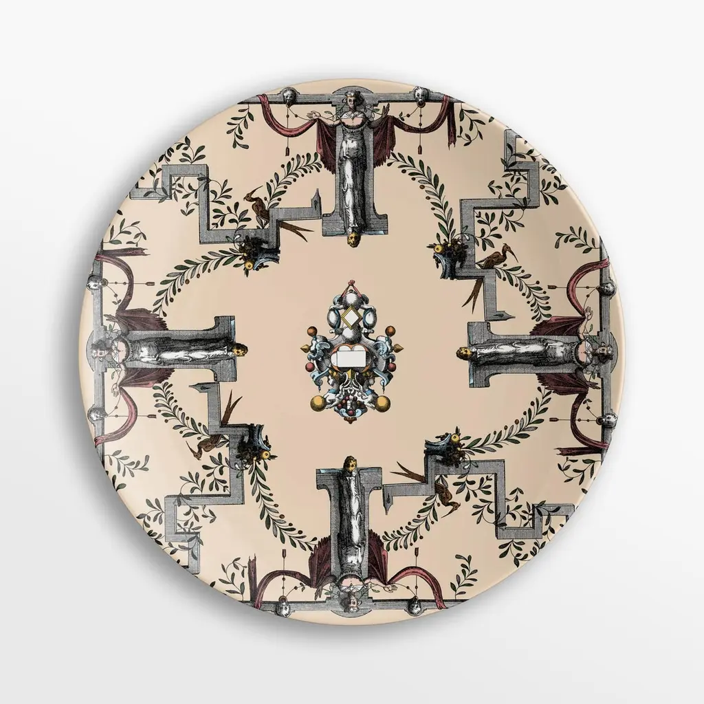 The porcelain collection Pompei by Grand Tour By Vito Nesta brings the Grottesche wall decoration back to life in a contemporary key. Ancient designs are taken and declined on the different formats of the mise en place in such a way as to create elegant and unique plays of overlapping. Natural elements, anthropomorphic figures, jewellery and architecture come together to create stories, decorations and geometries that fill the eye and intrigue the mind. This collection manages to be transversal, adapting both to regal and elegant tables and to more formal settings, elevating them with flair.Set of 6 dinner plates.
