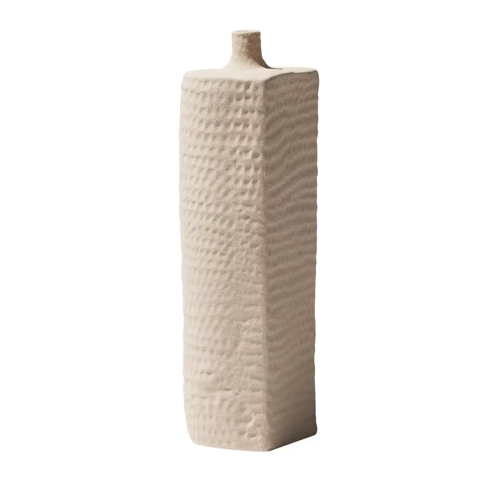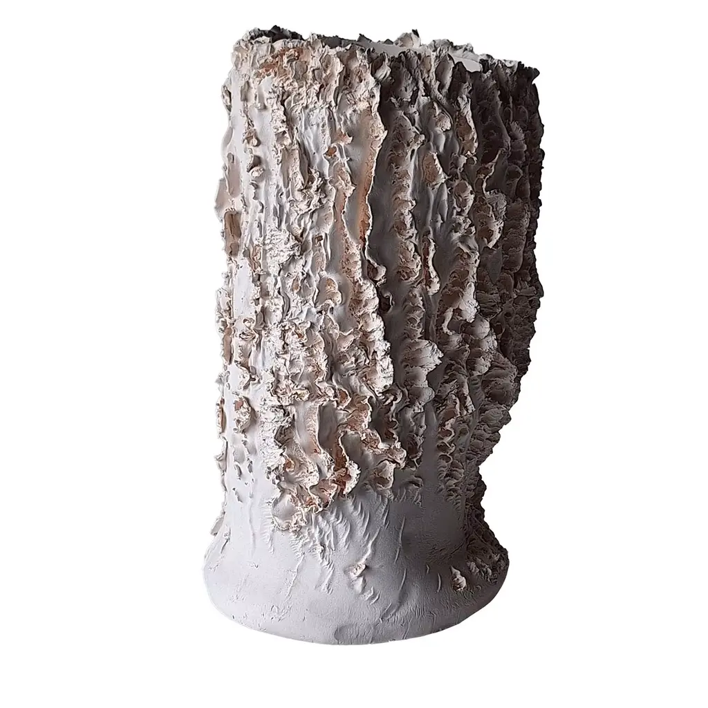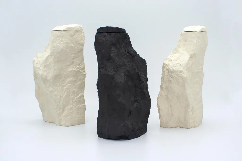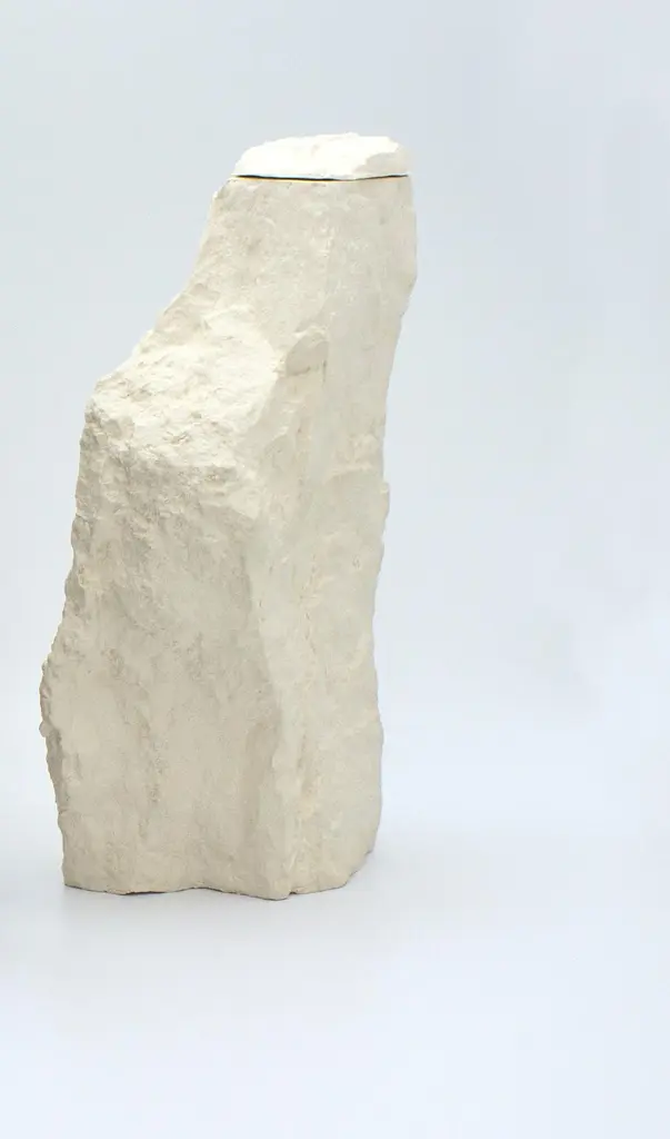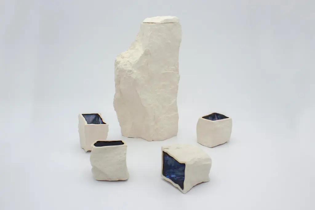 Porcelain carafe with lid by Craig BarrowDimensions: 7.5 x 10.5 x 20.5cmVolume approximate: 400mlMaterials: Slip cast porcelain shot cups, internally glazedVariations:Black porcelain, black glaze.Black porcelain, nebular glaze.White porcelain, white glaze.White porcelain, nebular glaze.A set of porcelain carafe and shot cups concerted over numerous visits to the Swedish island of Gotland in the Baltic Sea. Gotland has a rich abundance of sedimentary rocks that were deposited some 440 million years ago during the Silurian age when a warm, shallow, salty ocean covered the area. These rocks now stand as unique and unusual ancient rock Formations that scatter across the island’s land and shores. Not only producing a dramatic visual landscape, the rock is used extensively in the island’s building and infrastructure industry. The collection A Shallow and Salty Ocean is homage to the Gotland’s geographical and Industrial heritage. Moulds were taken from select fragments of limestone and cast in fine porcelain resulting in an ongoing series of vessels. The intricate stone texture and sharp, aggressive crystalline structure makes drinking with these pieces a unique experience, being as much functional as they are sculptural. The monotone unglazed exterior juxtaposes the gloss, colorful interior glaze, reminiscent of a shining mineral found within a broken rock. From the ancient ocean waters that first laid the rocky deposits, the roles of these two elements have been transformed through this collection; the ocean that was once a vessel for rock, the rock has now become a vessel for liquid.Craig Barrow is an artist and designer working in the areas of object and sculpture. Seeing design as responses to the world’s curiosities and shared relationships, his body of work stems from material exploration and production processes, observations of human interaction with objects and scientific and natural phenomena.Born in Nottingham, UK, currently based in Berlin.
