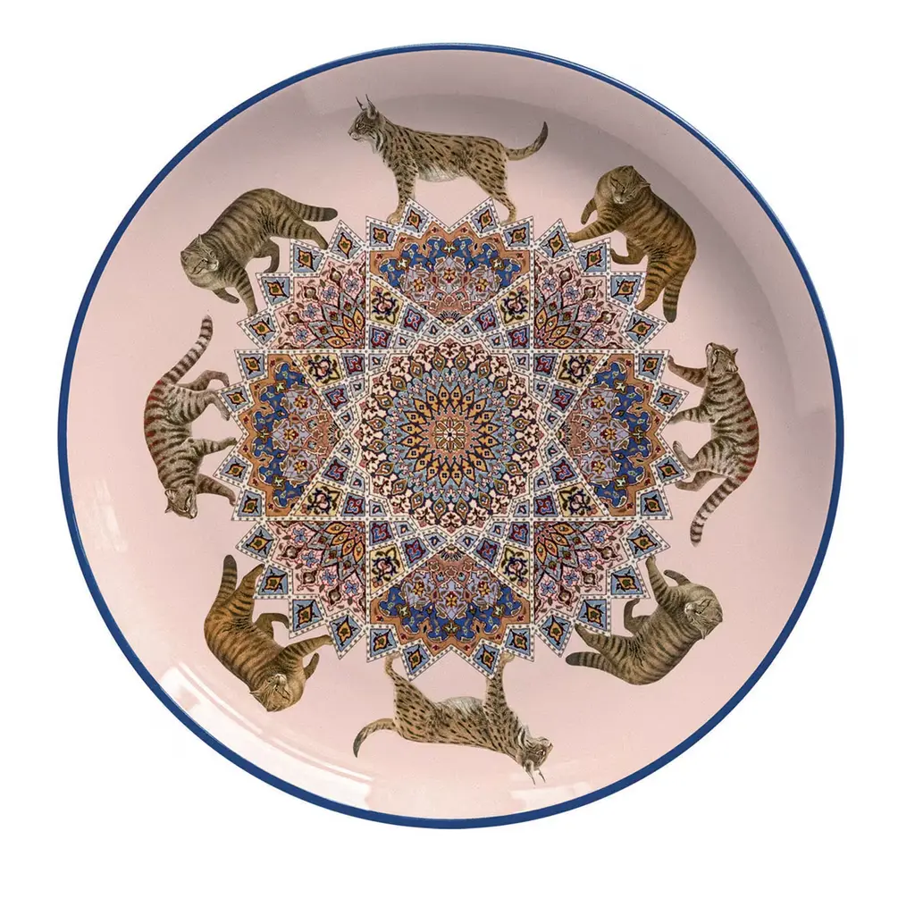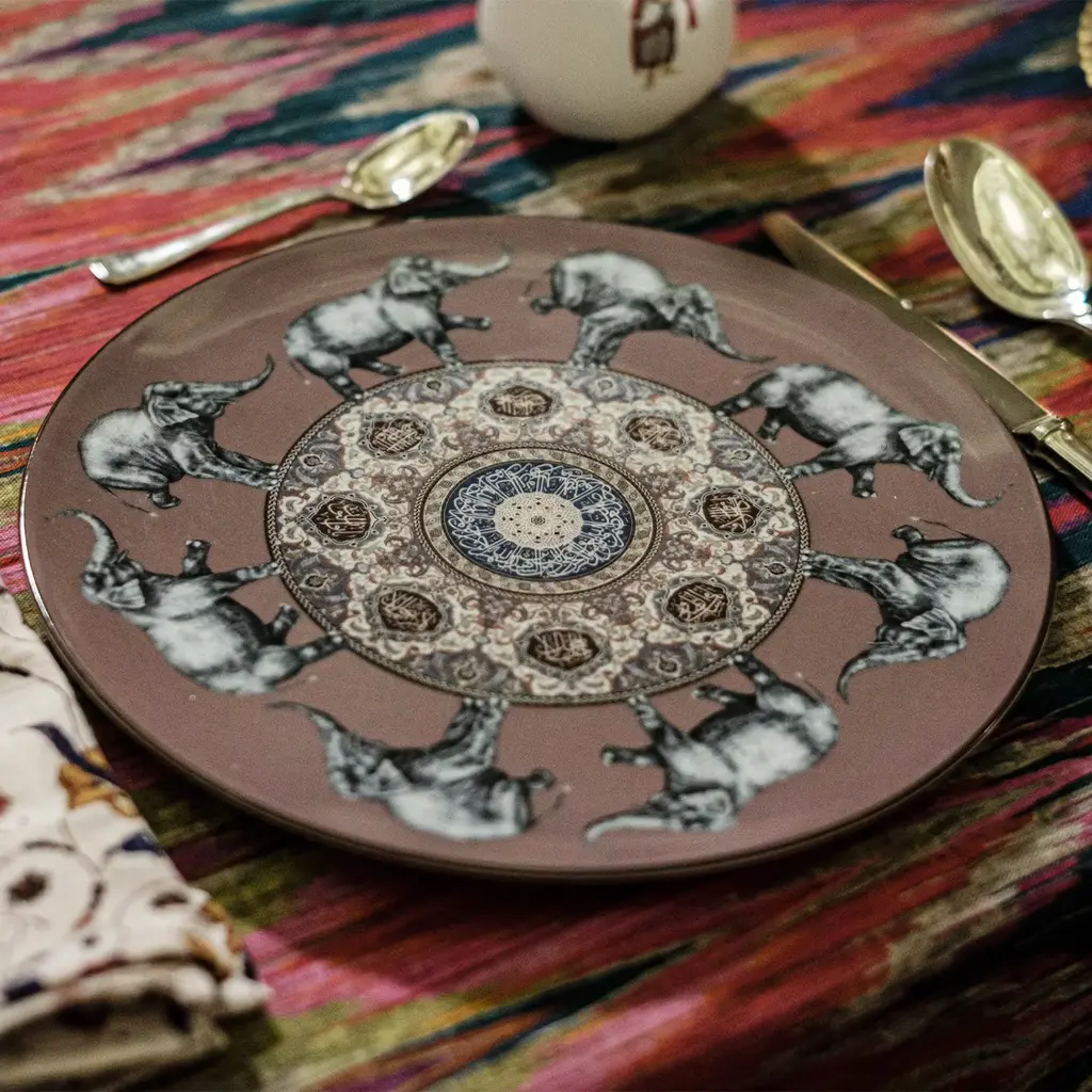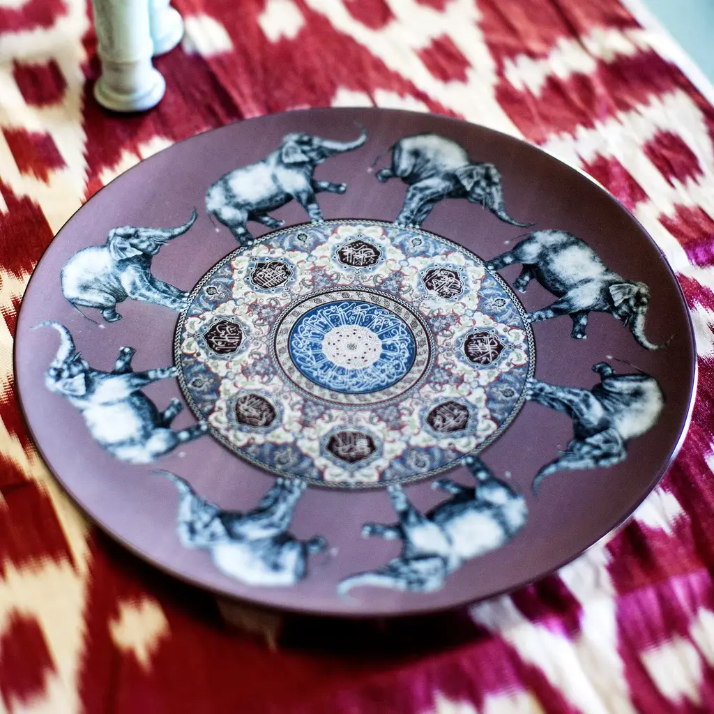 Inspired by the opulence of the Ottoman Empire and its capital, this porcelain plate is part of the limited Constantinople collection and features a decoration of elephants depicted in all their vivid details over a central circle adorned with central-Asian decorative patterns. The delicate purple of the background is highlighted at the rim with a line in dark purple. This piece will make a striking addition to any dinner table either if paired with others like it, or if mismatched with items from other Constantinople series.
