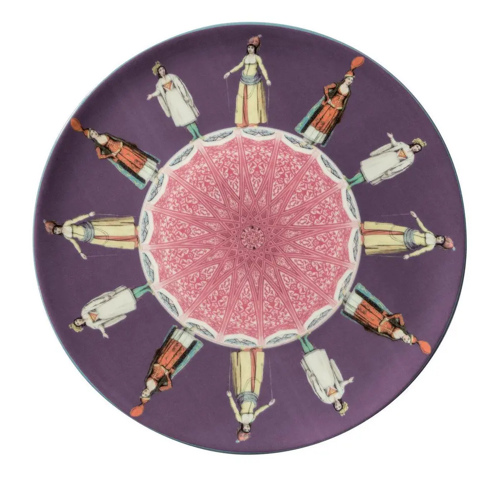 Part of the Constantinopoli collection, inspired by the exotic life in the capital of the Roman/Byzantine Empire, this set of two dessert plates is one of 12 designs made of porcelain. Vito Nesta's interpretation of the mesmerizing Turkish architecture and of the traditional costumes of the Sultans creates a unique decoration that features an abstract pattern in pink at the center, with a series of stunningly dressed figures over a purple background. This set will make a statement, either to serve small refreshments with tea or combining these two plates with others of the same series.