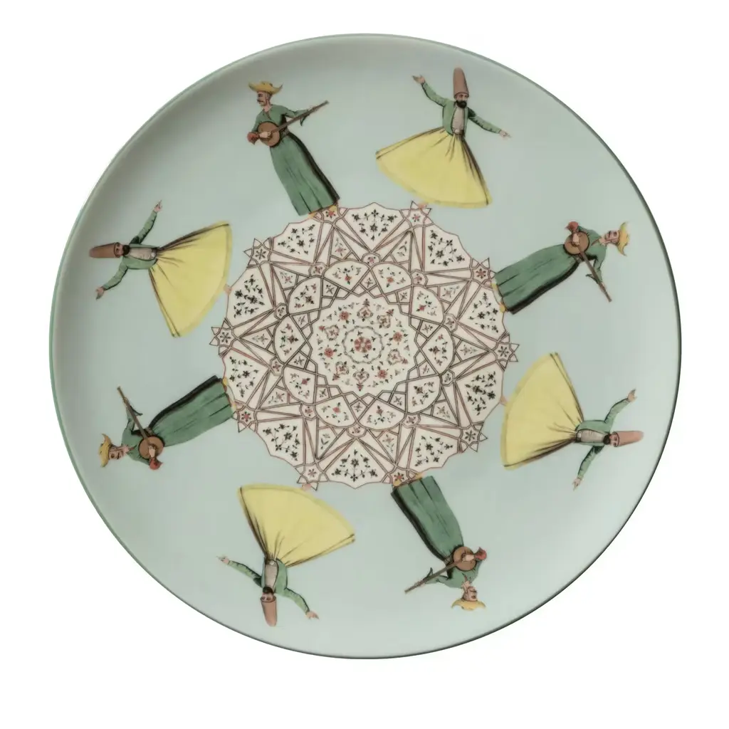 The sense of gracious movement and delicate color combination of this stunning set will enliven any home, bringing to the table a refined and dream-like ambiance. The set comprises two dessert plates crafted of porcelain, and is part of the Constantinopoli collection that combines images inspired by architectural details and costumes of the old capital of the Byzantine Empire. In this case, the mint-green color of the background is adorned with musicians and Dervishes dancing, while the center is an abstract design of clear Turkish influences.
