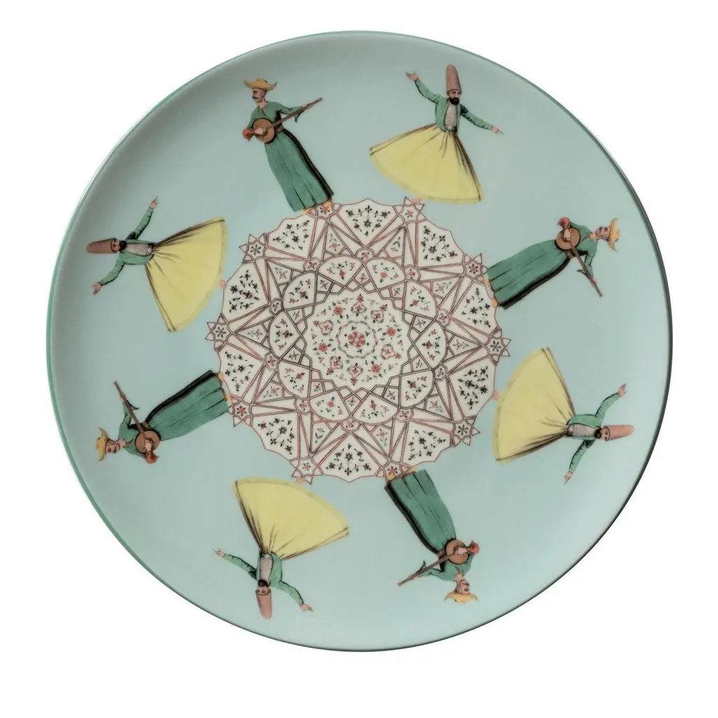 The sense of gracious movement and delicate color combination of this stunning set will enliven any home, bringing to the table a refined and dream-like ambiance. The set comprises two dessert plates crafted of porcelain, and is part of the Constantinopoli collection that combines images inspired by architectural details and costumes of the old capital of the Byzantine Empire. In this case, the mint-green color of the background is adorned with musicians and Dervishes dancing, while the center is an abstract design of clear Turkish influences.