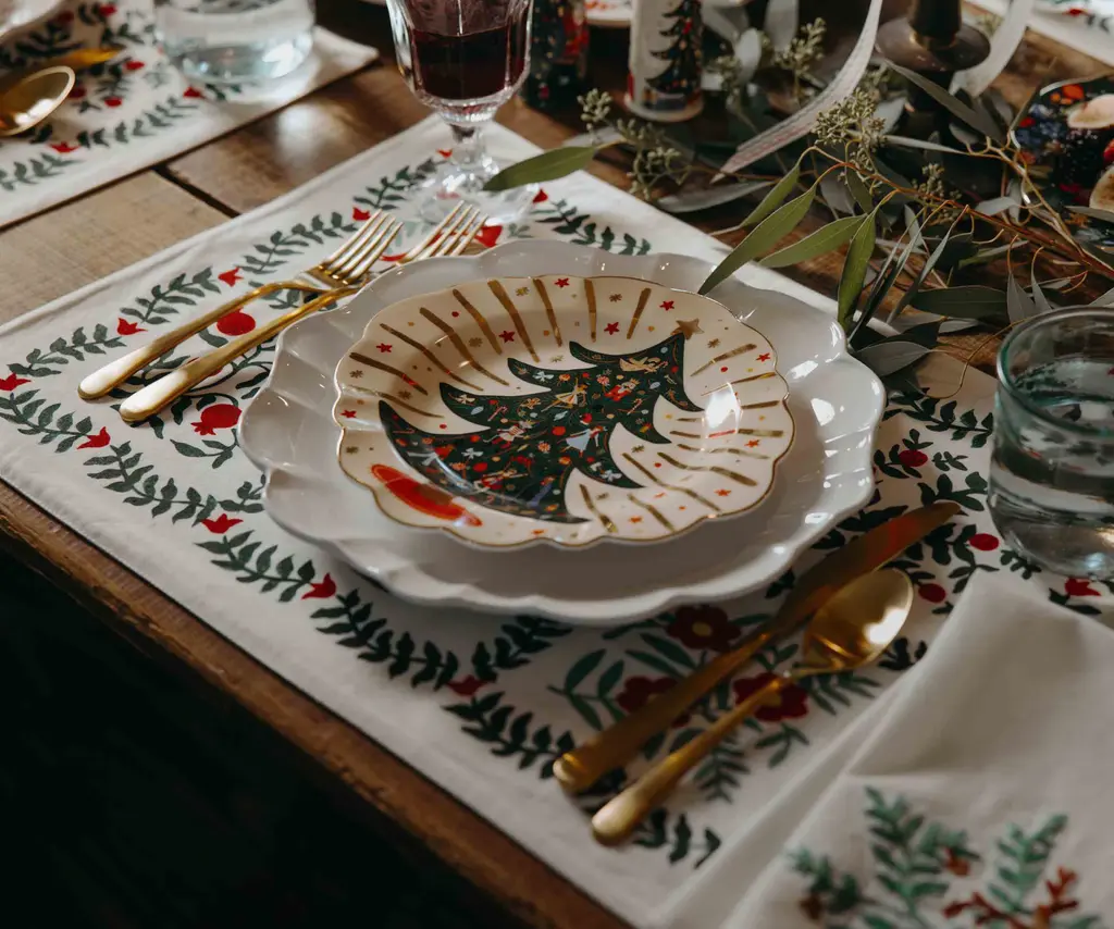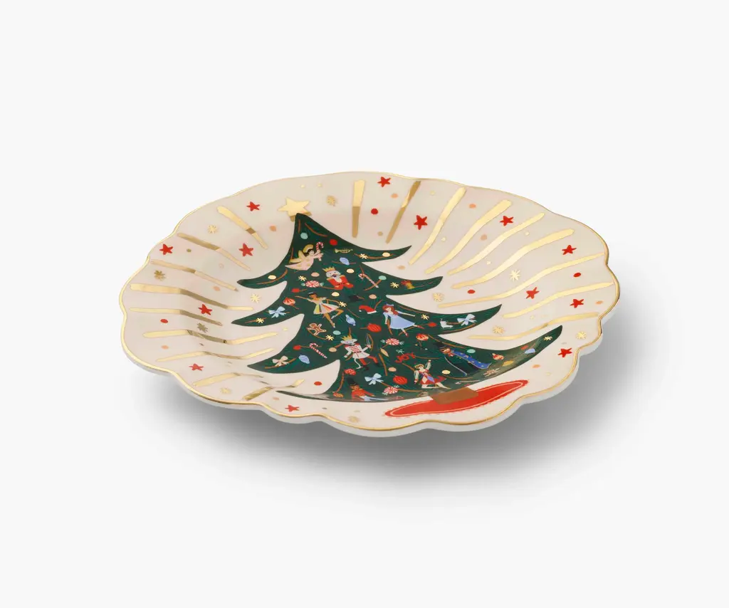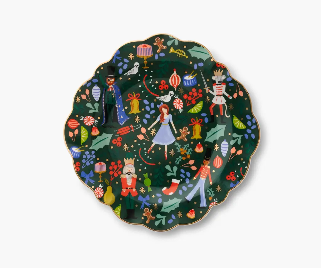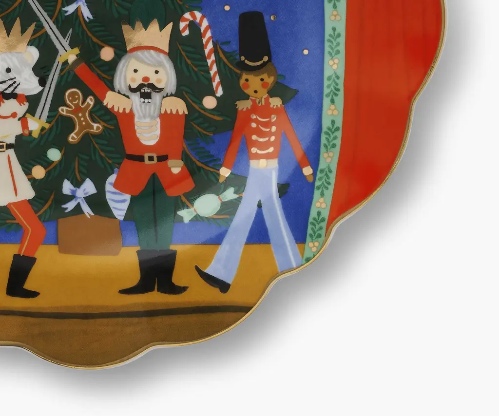 A set of four assorted dessert plates featuring four festive scenes and metallic gold foil, including a decorated tree, our favorite characters from the Nutcracker ballet, and other holiday icons.