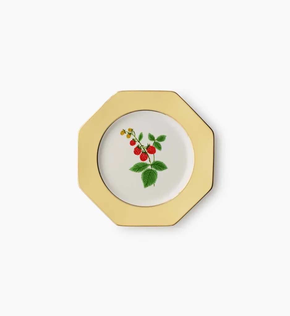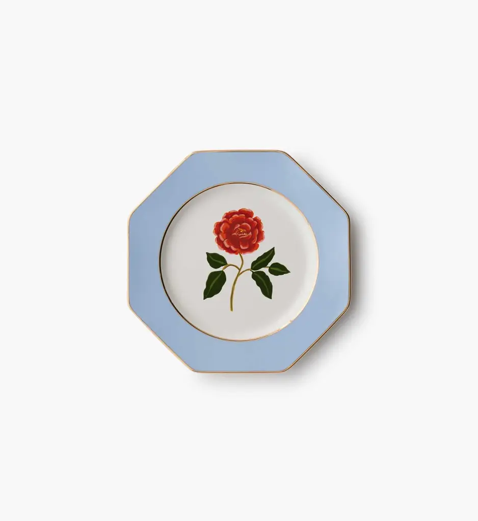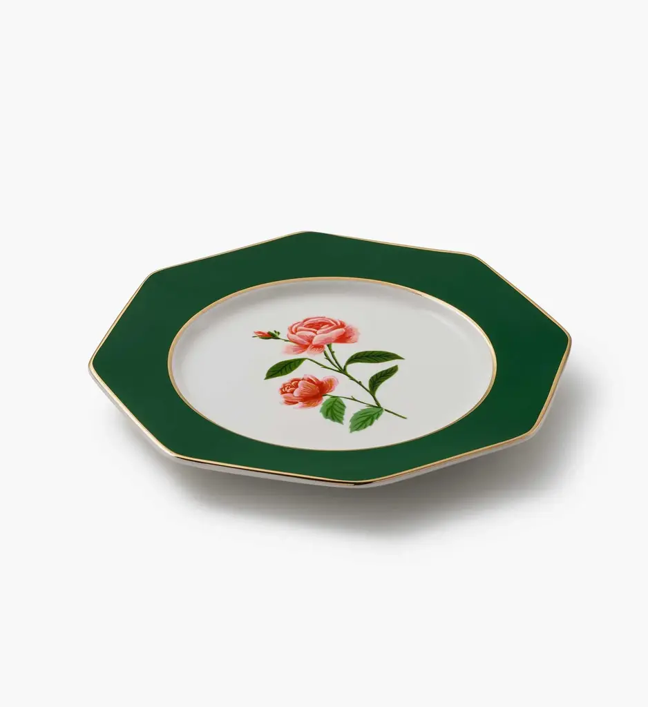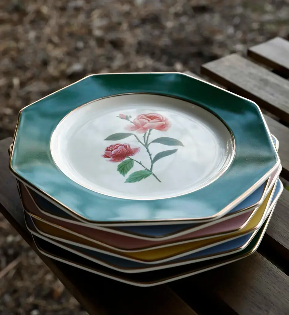 Elegant painted roses adorn these porcelain dessert plates, featuring four distinct designs, shimmering gold accents, and gold-painted edges.