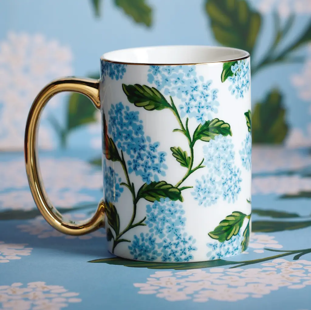 A timeless design of hydrangeas bloom on this porcelain mug, with a gilded rim and handle to add a little something special to your favorite beverage.