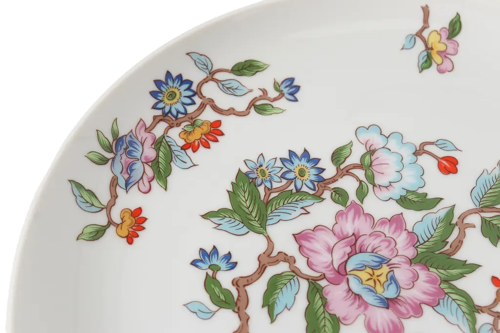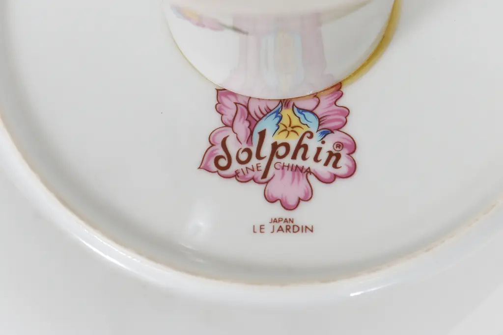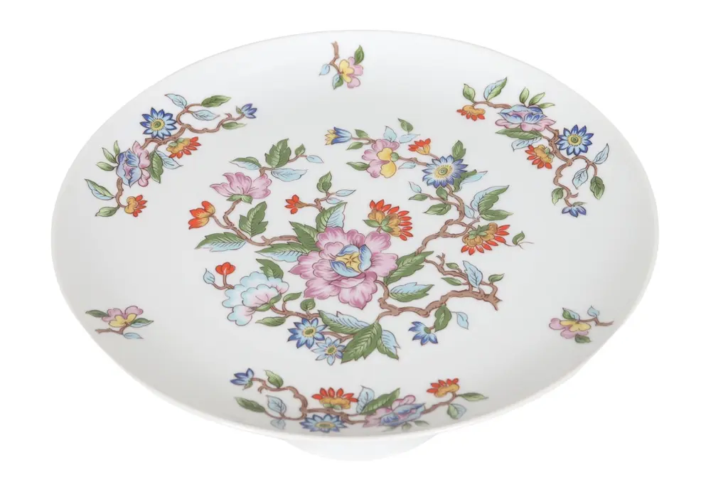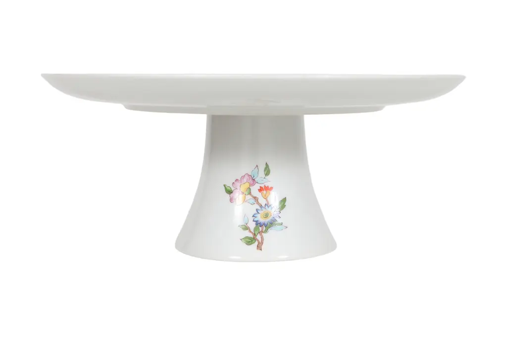A white porcelain pedestal cake stand in the Le Jardin pattern, made by Dolphin Fine China of Japan. Decorated with delicately painted and brightly colored pink, blue and orange flowers amid intertwining foliage on the plate, and with bouquets of flowers on the foot.