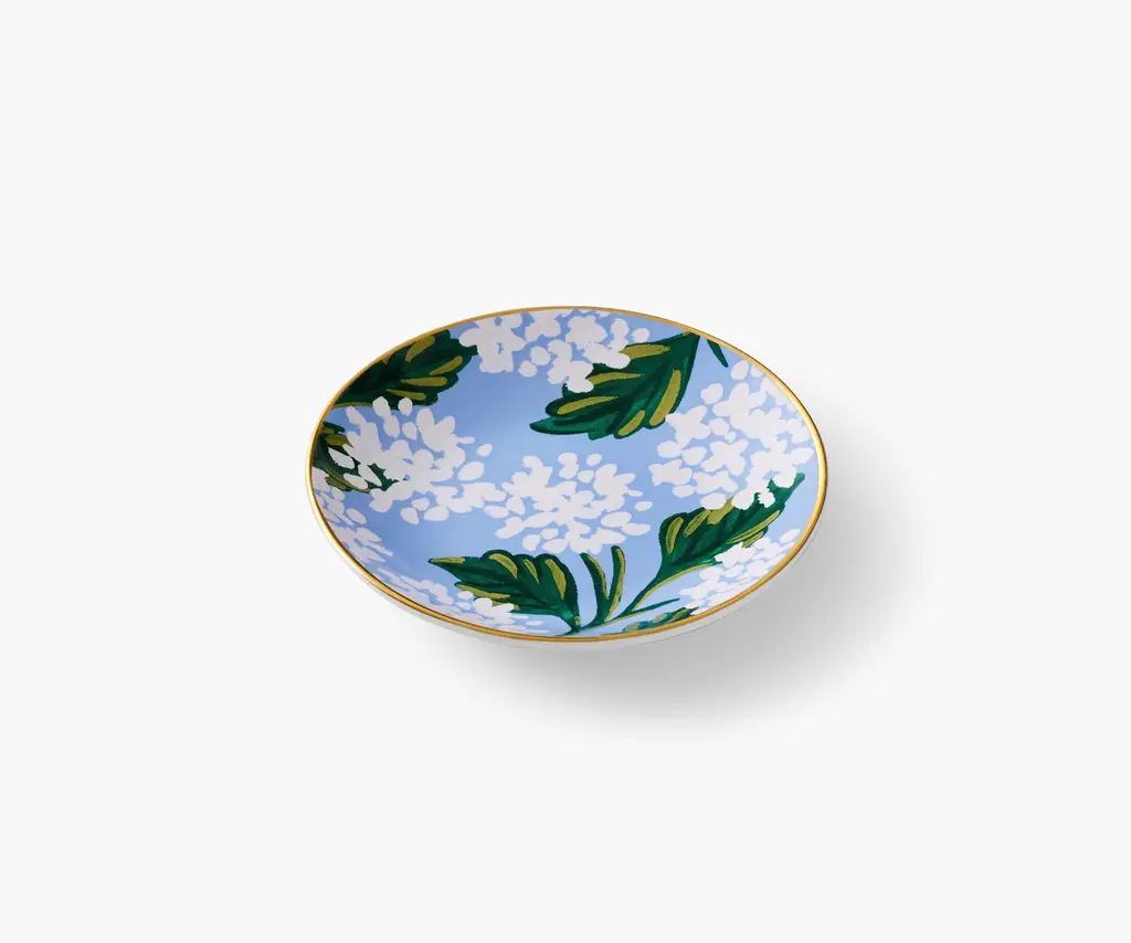 Keep this ring dish by your desk, the sink, or on your nightstand, and keep all your small, special things safe. The porcelain dish features our illustrated Hydrangea florals and a metallic gold rim for extra shine.