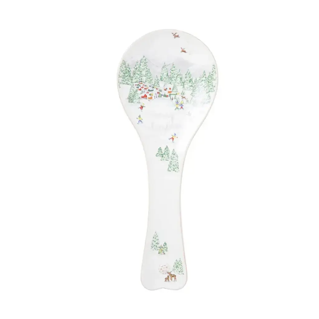 A porcelain spoon rest perfect for preparing holiday feasts, featuring gold foil accents and illustrated characters from the classic ballet.