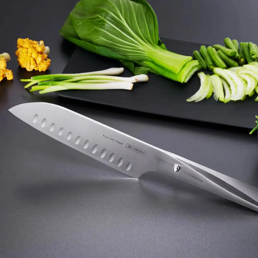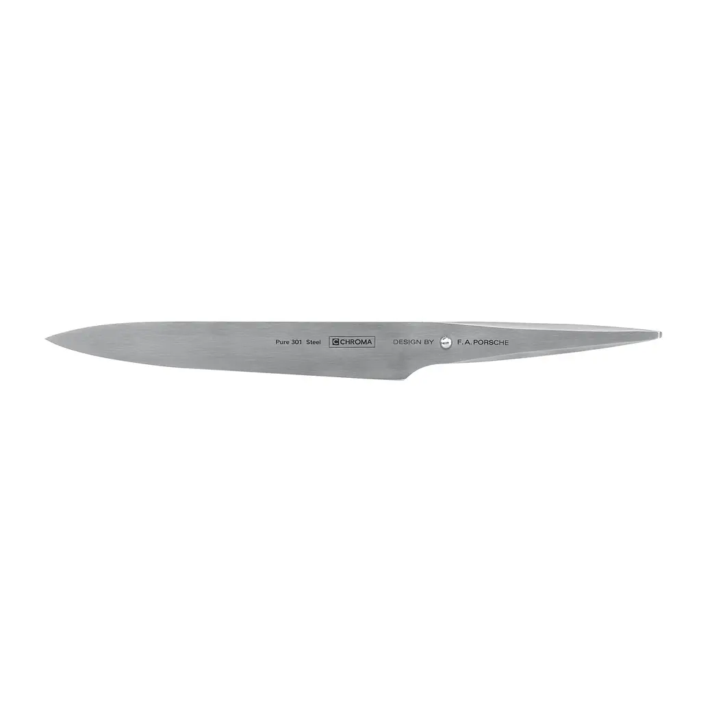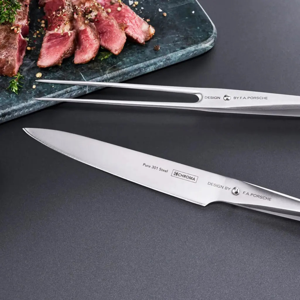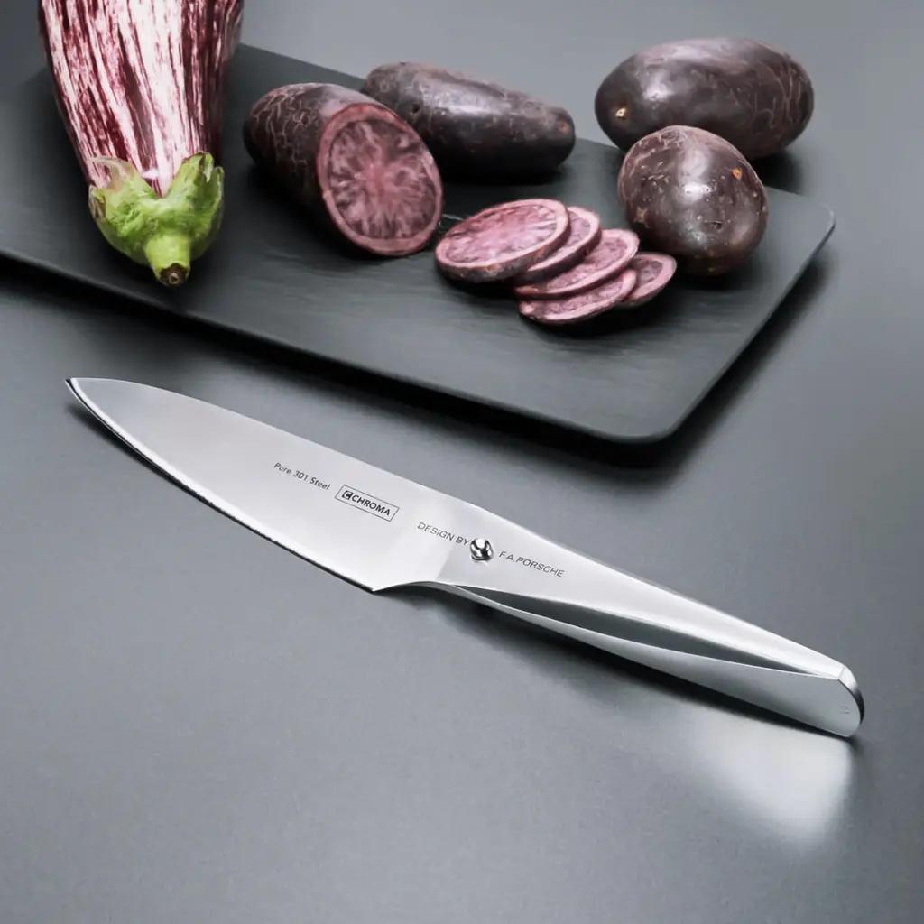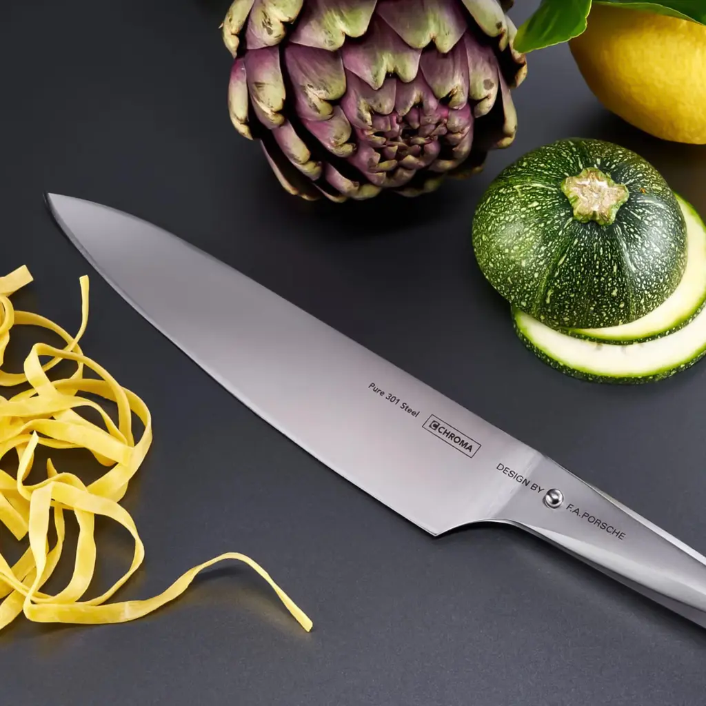 Sometimes, a knife is not only a kitchen tool. Just like a Porsche 911 is not just a car. Designed by German designer F. A. Porsche, the creator of the legendary Porsche 911, the award-winning Chroma Type 301 collection is as sleek and gorgeous as the sports car itself. This set includes seven Porsche knives Type 301. Made for both professionals and amateurs chefs, the knives are comfortable to hold and a joy to admire. Of course, they are also crafted with performance in mind. Featuring Japanese 301 stainless steel blades, each knife is carefully sharpened by hand to cut with precision, every time. Seamless, ergonomic handles offer excellent control while cutting, slicing, and dicing ingredients. The Chroma Porsche Type 301 Knife Set comes with every knife you might need in the kitchen: a chef’s knife, carving knife, bread knife, paring knife, utility knife, veggie knife, and santoku knife. The Porsche knives collection has received the prestigious iF Design Award.
