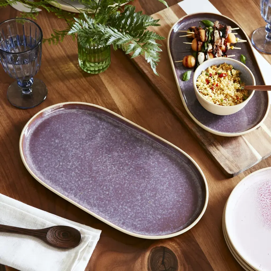 This Minerals Amethyst Large Oval Platter from Portmeirion blends honest materials with the beauty of nature. Made from recycled clay, its oval shape is textured on the outside and coated on the inside with a reactive glaze to make every platter unique. Presented in recyclable packaging.