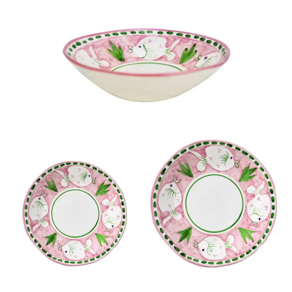 Perfect to be arranged with other pieces from the Poseidon Collection to achieve a cohesive, marine-inspired look, this ceramic set includes six dinner plates (⌀ 29 cm), six soup plates (⌀ 23 cm), and six fruit plates (⌀ 23 cm). White on the outside, the plates' inner border is accented with a splendid, hand-painted decoration coupling stylized azure seaweeds and white fish whose profile emerges from the vivid green enamel underneath.