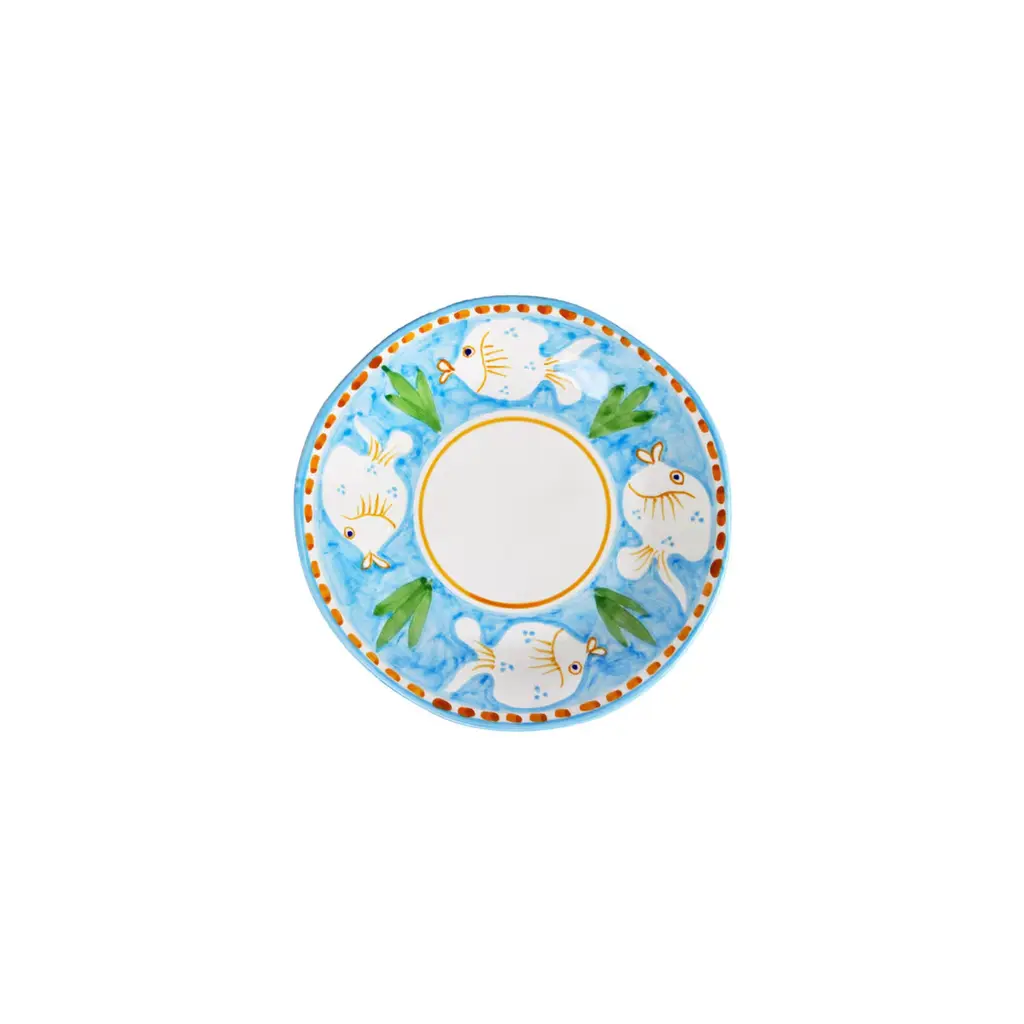 Fashioned of fine ceramic, this fascinating set inspired by marine atmospheres - hence the name Poseidon, the Greek god of the sea - comprises six dinner plates (ø 29 cm), six soup plates (ø 23 cm), and six dessert plates (ø 23 cm). Each piece is decorated with white fish on a turquoise background alternating with green bunches of seaweeds. The further, graceful ocher details enrich the decorative value of the set.