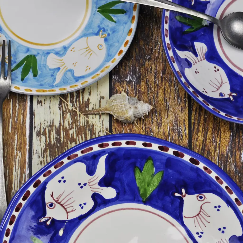 Perfect to imbue any table with the vital allure of sea fauna and flora, the six circular charger plates composing this ceramic set are entirely painted by hand. On the wide, inner rims green seaweeds alternate with white fish whose profile emerges from a darker background in a deeper hue of blue. Brown enamel is used to add further dainty, decorative details to these lively designs inspired by Poseidon, the Greek god of the sea.