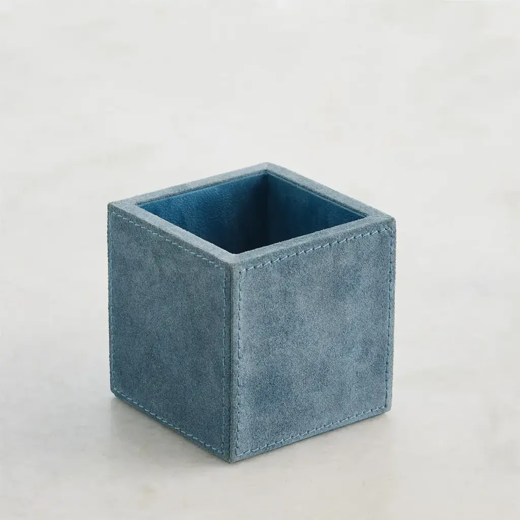 The Posh Pencil Cup is beautifully wrapped in dusty blue suede leather, combining functionality with a touch of sophistication for your workspace. Lined with soft microsuede, it offers a stylish way to organize your writing tools. From a fashion forward perspective, Global Views offers accessories, furniture, statement lighting, and an assortment of rugs and mirrors to add beauty and joy to your home.