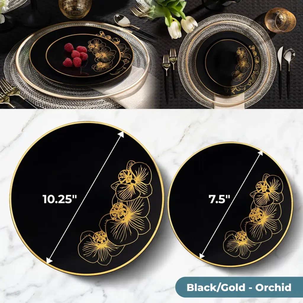 Posh Setting 32 Piece Combo Black And Gold Round Plastic Dinnerware Set - 16 Servings - Orchid
