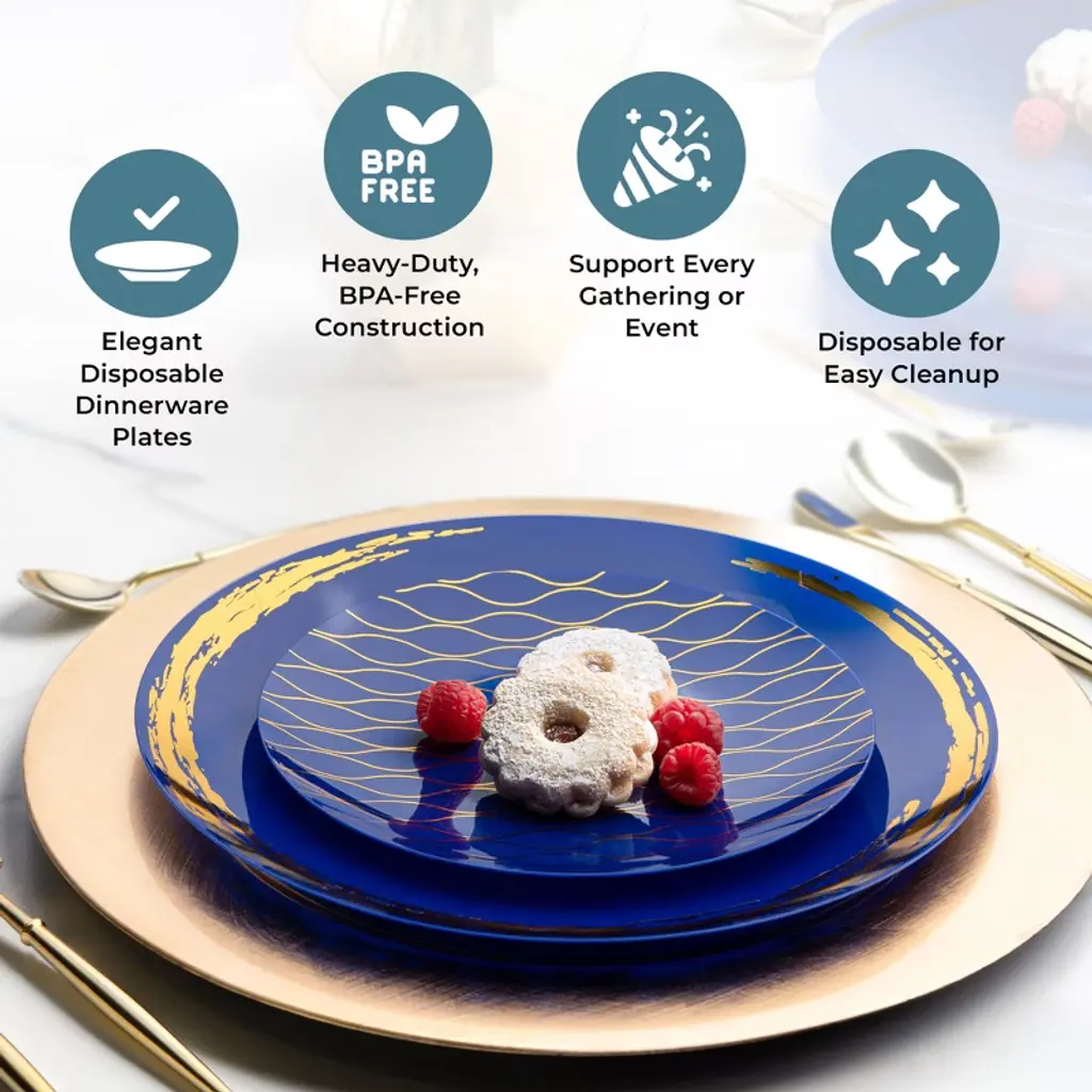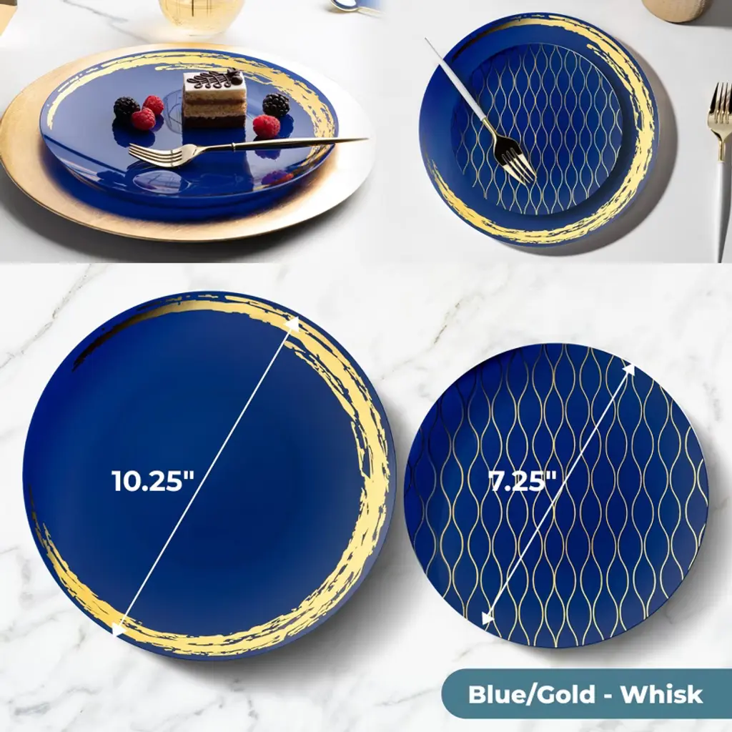 Posh Setting 32 Piece Combo Pack Blue And Gold Round Plastic Dinnerware Set - 16 Settings - Whisk