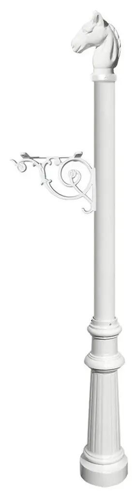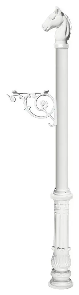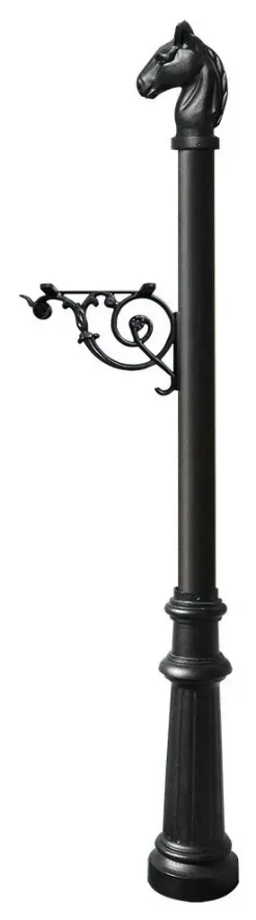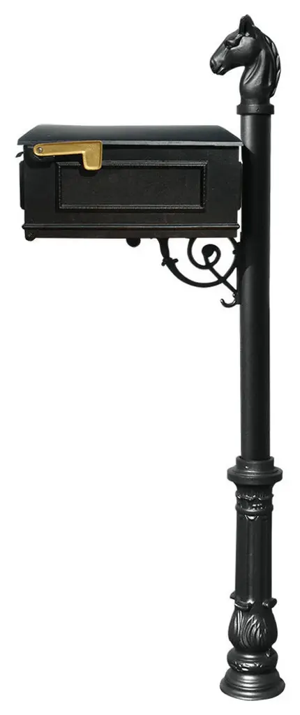 Lewiston Equine post system with E1 Economy mailbox, mounting plate, ornate base and horsehead finial, BlackOur Lewiston Equine Post is made from rust-free cast aluminum with a durable weather resistant finish and comes with a E1 Black Economy Mailbox, support brace with mounting plate, decorative horsehead finial and ornate base. E1 Economy mailbox is made of galvanized steel with a smooth rust-resistant finish, steel latch and red aluminum flag. Post, support brace, finial and base color: Black.Beautiful post with fluted base and horsehead finialThe post mounts deep down into your lawn or sidewalk and is made from solid cast aluminumProtective, weather-resistant, black powder coated finishIncludes mailbox mounting bracket and support braceComes with E1 Economy mailbox, which is made of galvanized steel with a smooth rust-resistant finish, steel latch and red aluminum flag.Product Dimension: 6.5"x19"x5''2"Color: Black