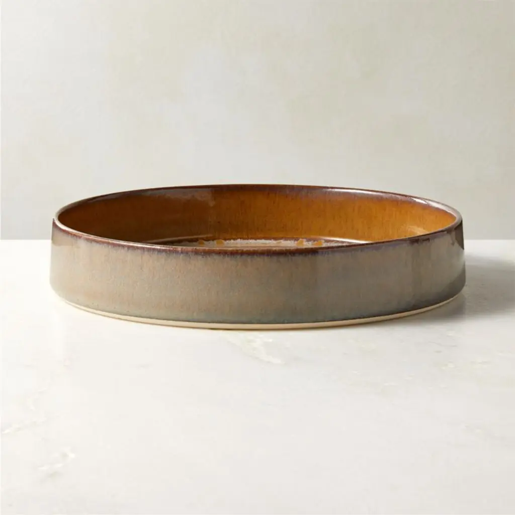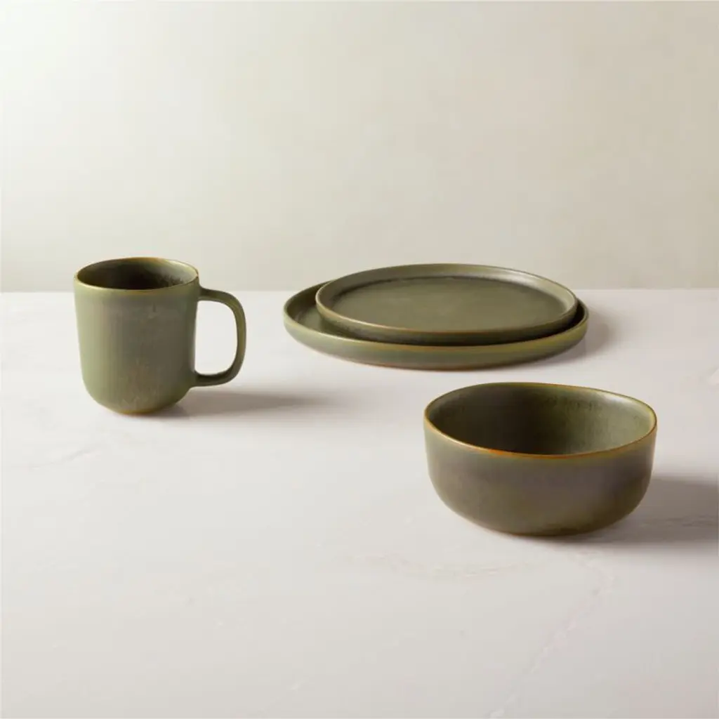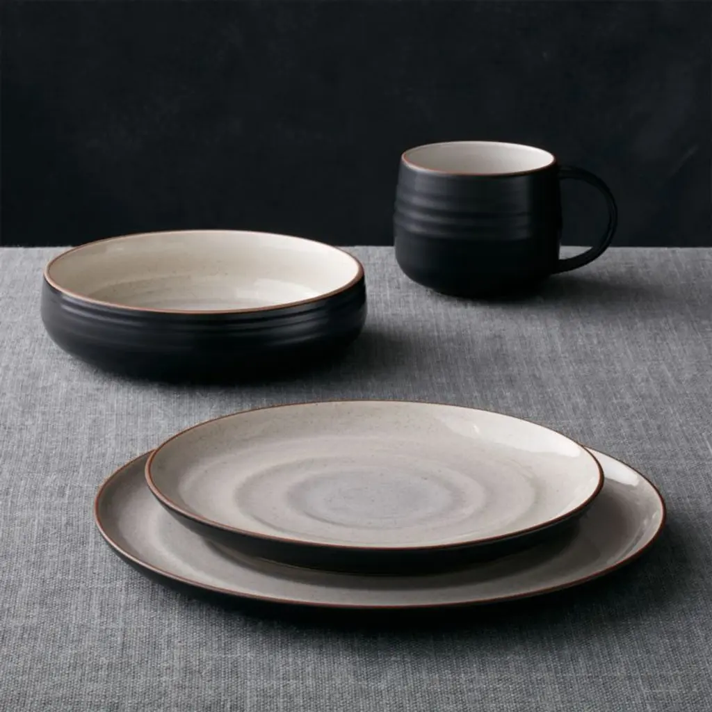Made by hand in Portugal, our Prado stoneware dinnerware features modern silhouettes and a rich, tonal reactive glaze that makes each piece appear to subtly shift in color. Due to the nature of this glazing process, each piece will have slight variations that add to its beauty. Set includes a dinner plate, salad plate, pasta bowl and mug. CB2 exclusive.