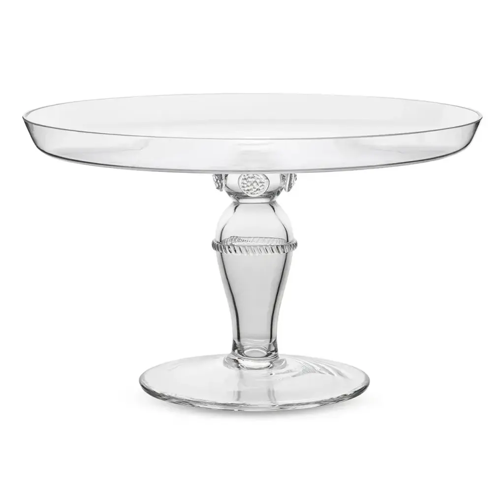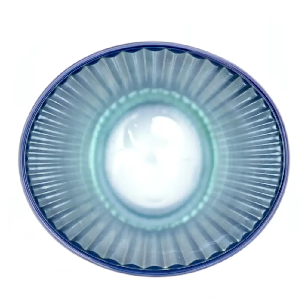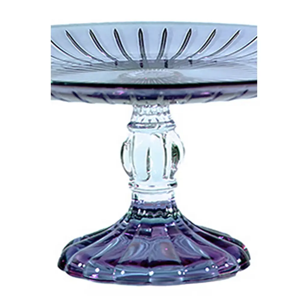 This stylish cake stand will infuse magical charm in a monochromatic contemporary interior. Its glass body comprises a clear stem rising from a pleated base and linked to the flat, grooved tray both sharing a sophisticated tone of blue enlivened by a flattering iridescent finish.