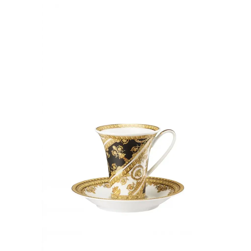 This exquisite Versace dinnerware is called Prestige Gala Le Bleu. It is produced using the finest porcelain creating a style that is best described as luxurious and glamorous. Lavish ornaments decorate this piece and make it a 'must have' for everyone in love with opulent design. With this decor the colors are melted into the glaze at 1000 degrees C. Here the glaze softens and the decor sinks into it, thus making color and luminosity indestructible. It is scratch- and wear-resistant. However, gold decors are not totally scratch resistant by virtue of their natural material properties. This decor was tested by the Rosenthal Institute for Material Technology (IWT).