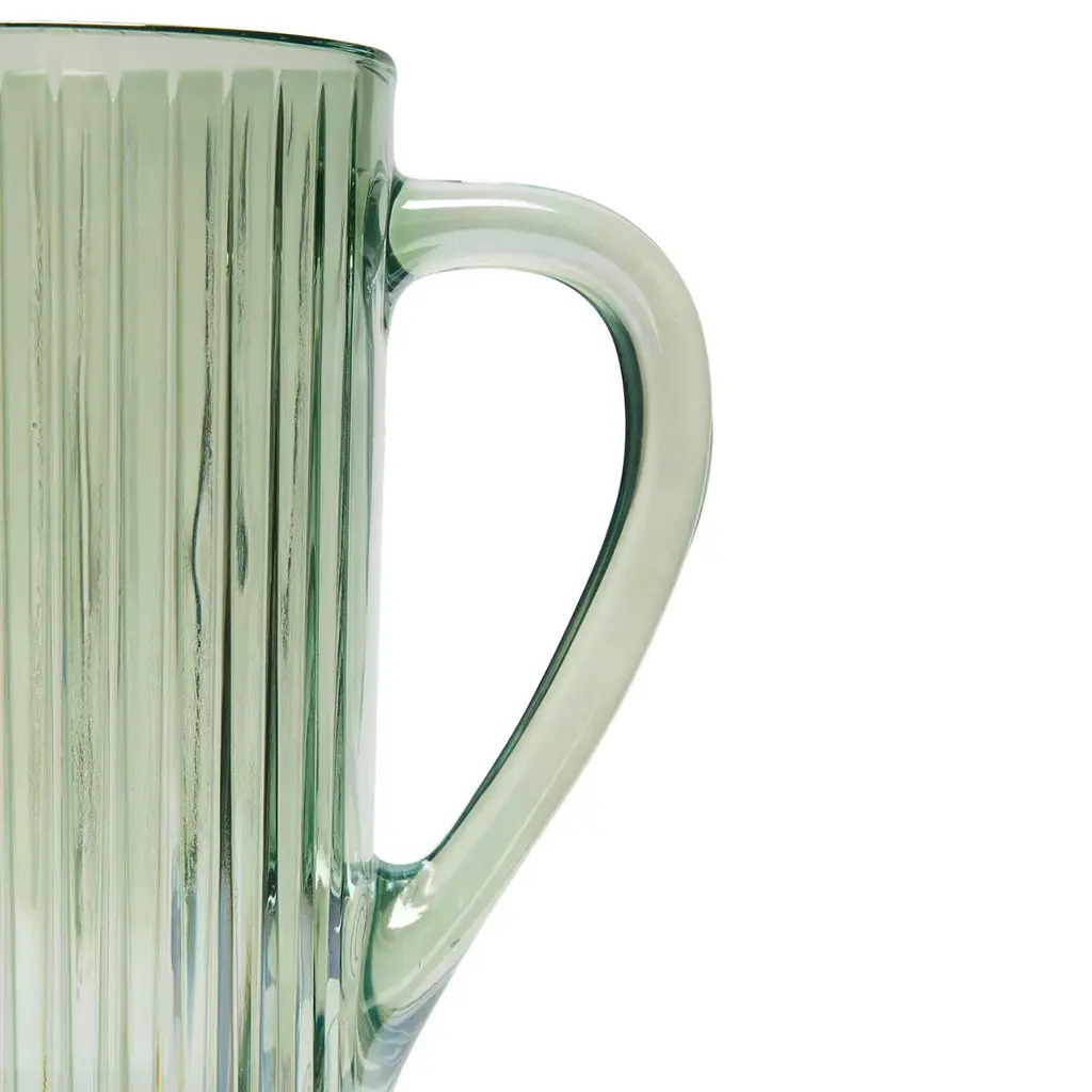 A soft pastel green hue that slightly fades towards the round base graces the ridged cylindrical silhouette of this elegant pitcher. Fashioned of high-quality glass embellished with an iridescent finish, this sophisticated design is a superb choice to add a subtle dash of color to neutral-toned tables.