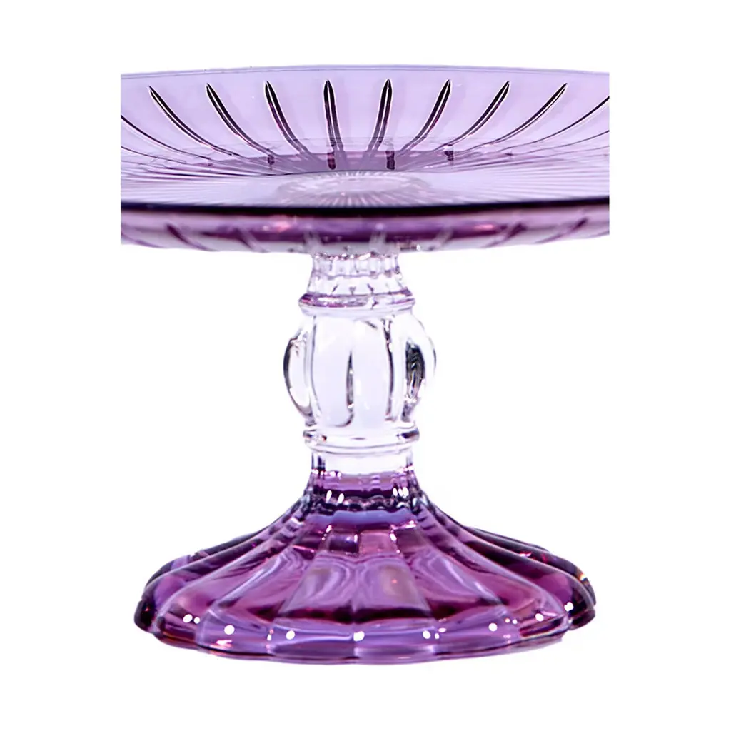 Combining whimsical design with a quintessential traditional material, this cake stand is the epitome of tableware sophistication. Its striking color combination is obtained by using clear glass for the sinuous stem and purple glass for both the round grooved tray sitting on top and the pleated base. A mesmerizing iridescent finish adds a unique decorative accent to complete the piece.