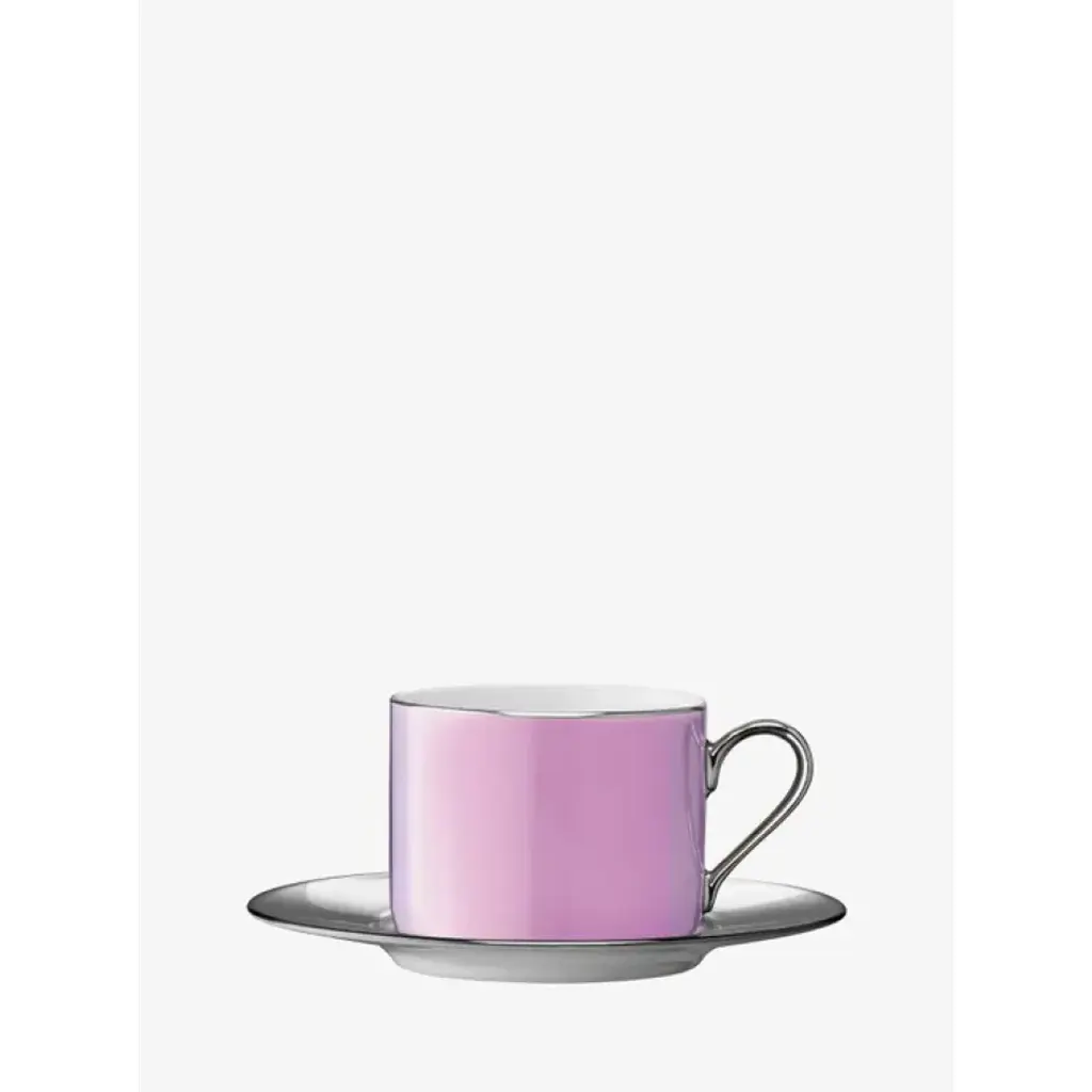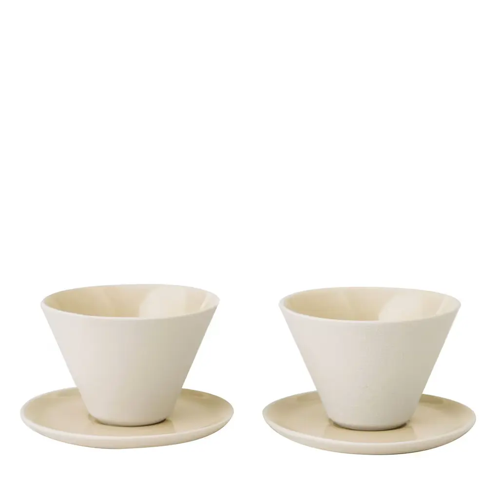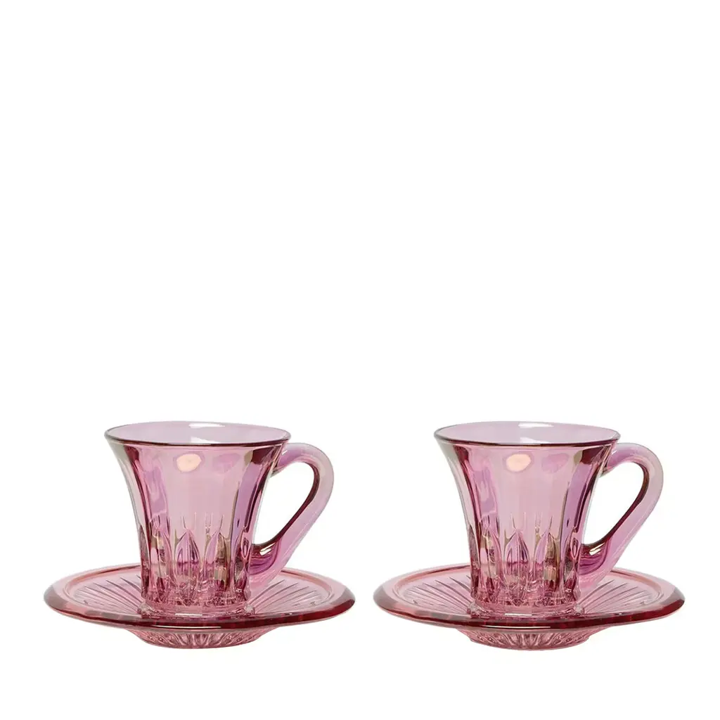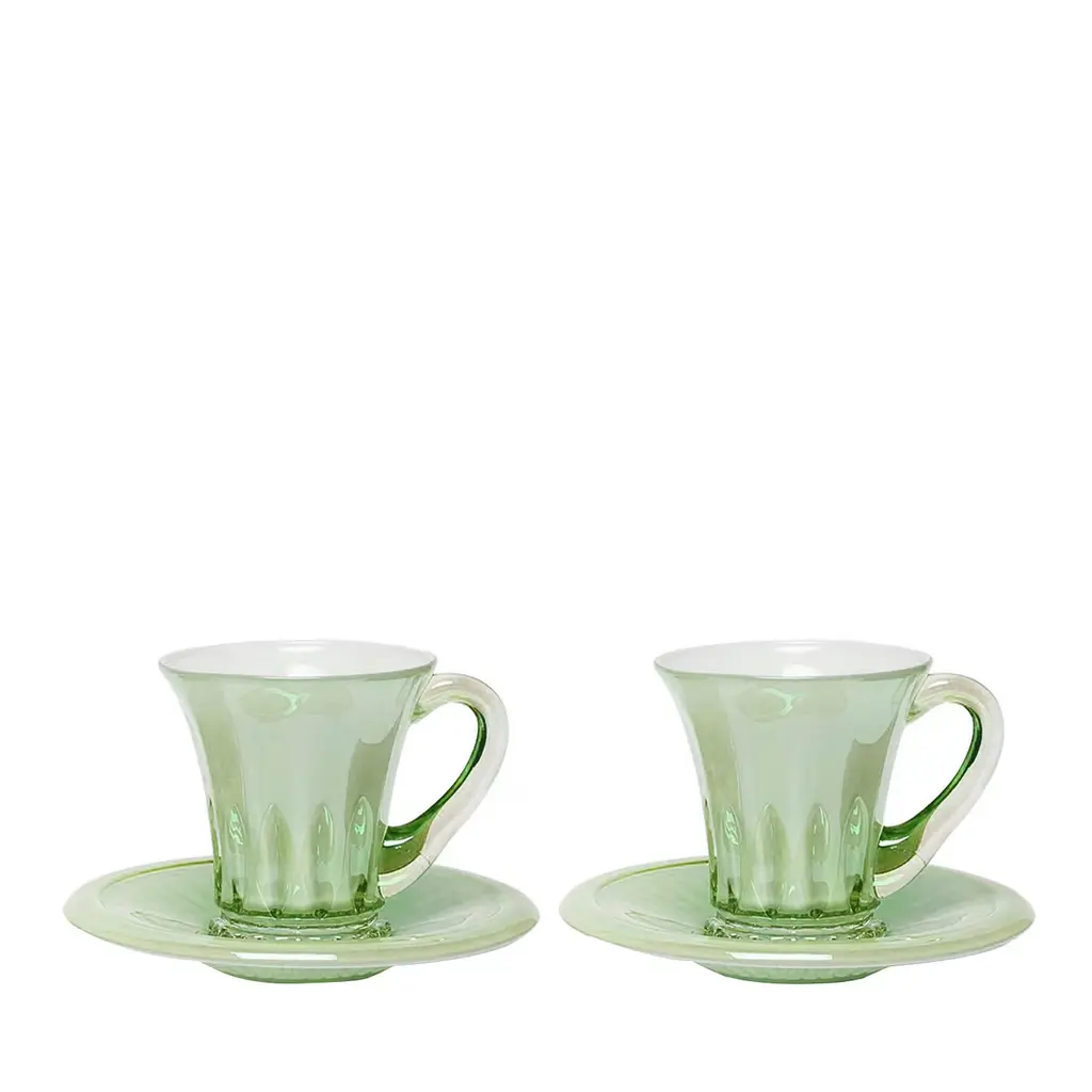 This glamorous set of two pastel-blue espresso cups with coordinated saucers is crafted of high-quality glass boasting an enchanting iridescent finish. Small ridges add a textural twist to the cups' smooth and flared silhouette while the graceful, curved handles complete the piece.