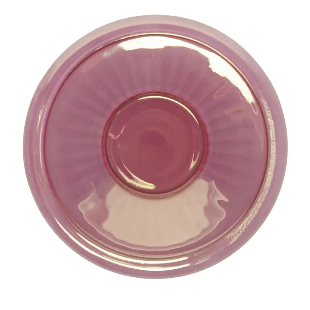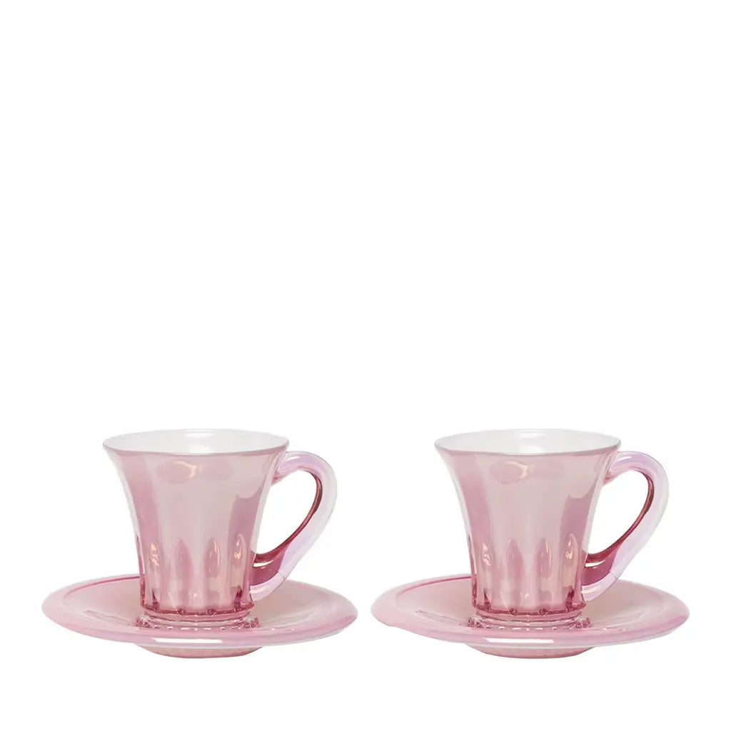 Distinguished by a timeless flair, this eye-catching set of two pink espresso cups with coordinated saucers is fashioned of high-quality glass enlivened by an iridescent finish. The thin ridges adorning the cups' flared silhouette and the saucers' reveal a captivating textural effect.