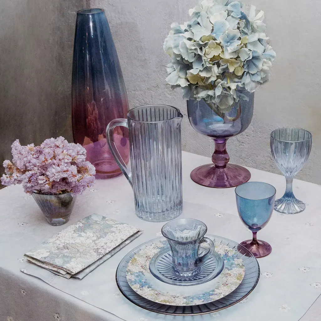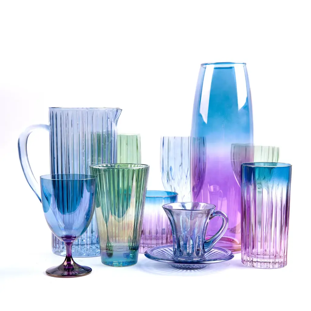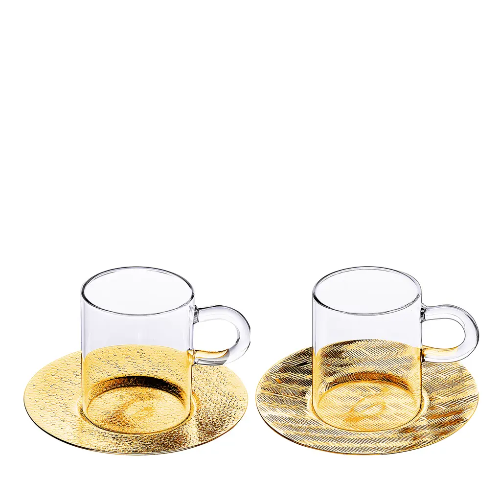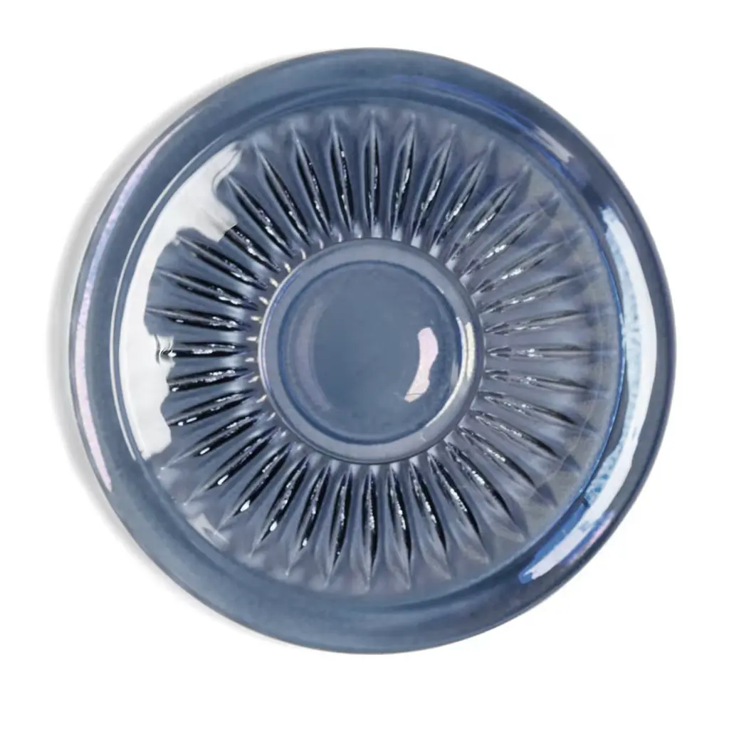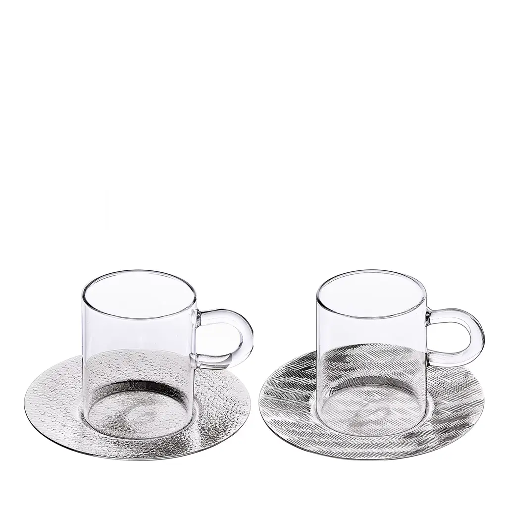 Perfectly paired with other blue items from the same collection for a cohesive look, this set of two espresso cups with coordinated saucers is crafted of high-quality, transparent glass with utmost care for details. Both saucers and flared cups share a grooved texture that gradually fades as it approaches the rims. A mesmerizing iridescent finish completes this stunning set, including the smooth, dainty cups' handles.