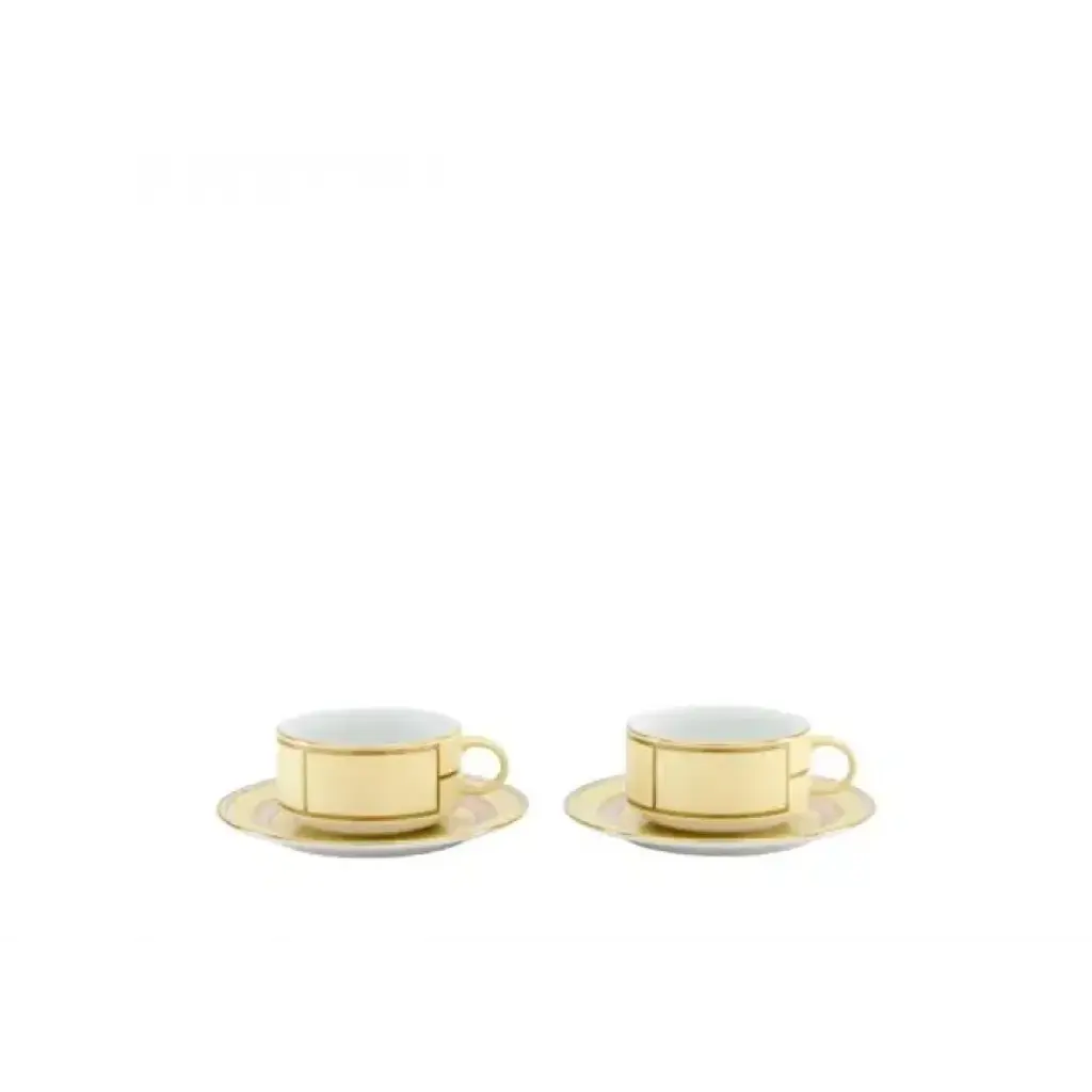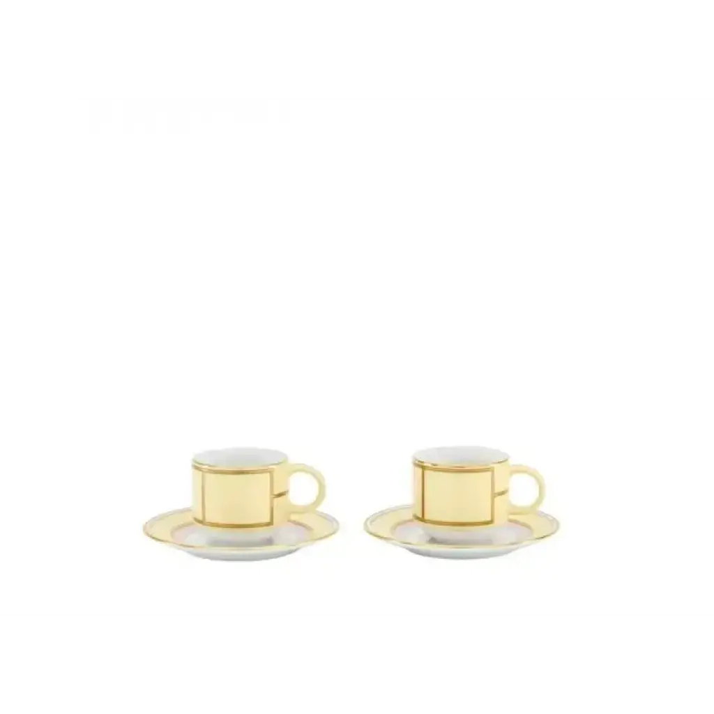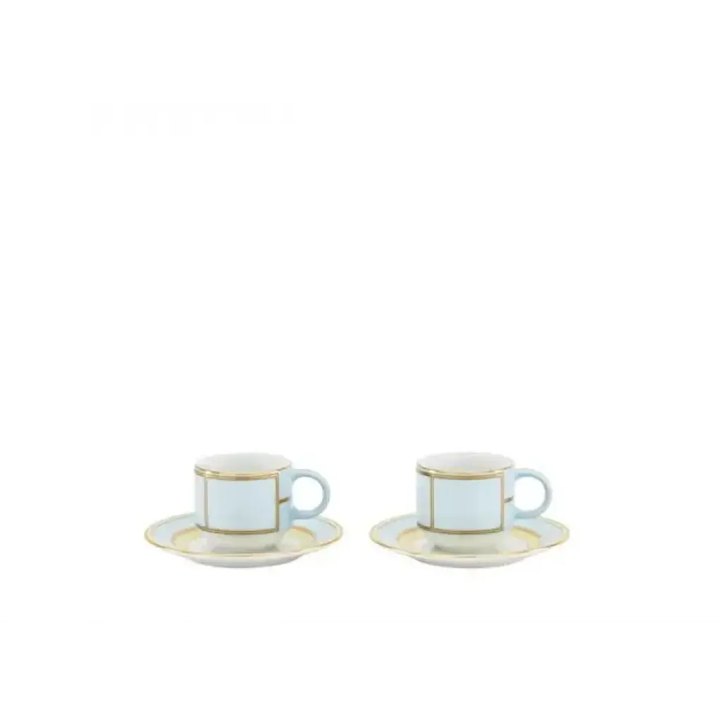 This glamorous set of two espresso cups with coordinated saucers is crafted of glass in a lively green shade and finished with an enchanting iridescent finish. Small ridges add a textural twist to both the saucers and the cups' flared silhouette, which is completed by graceful, smooth handles.