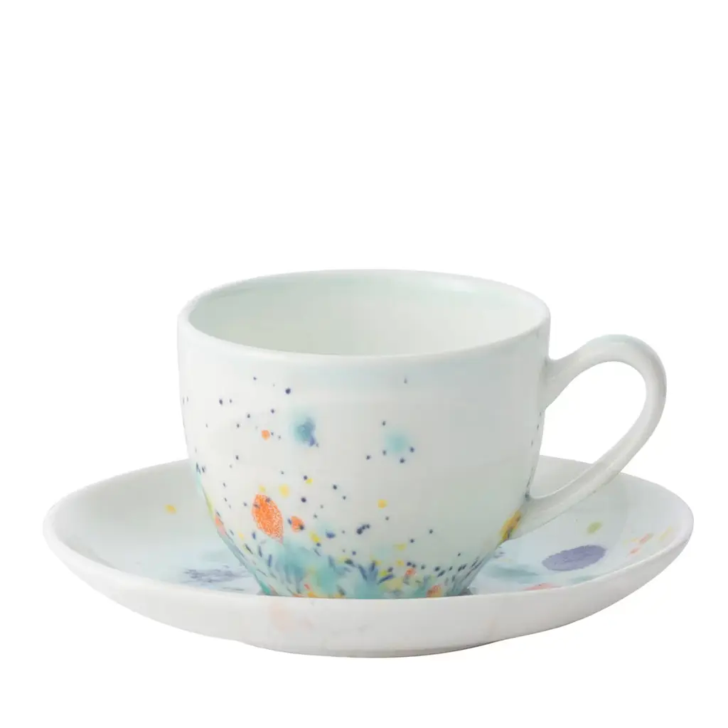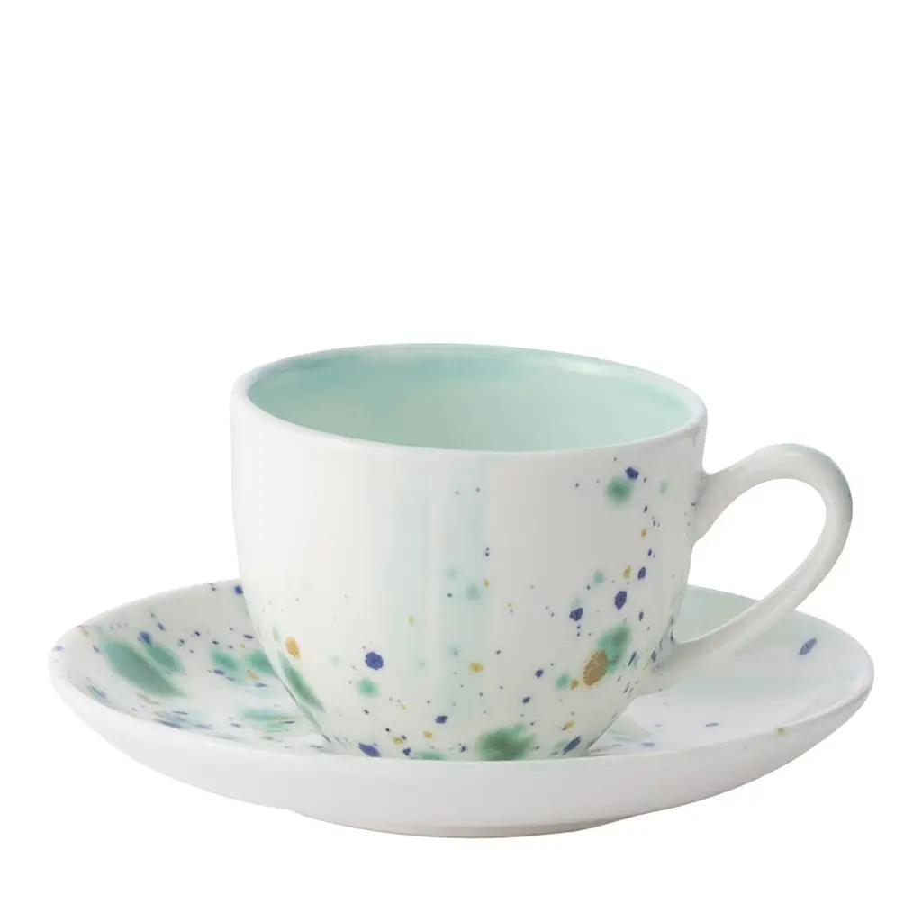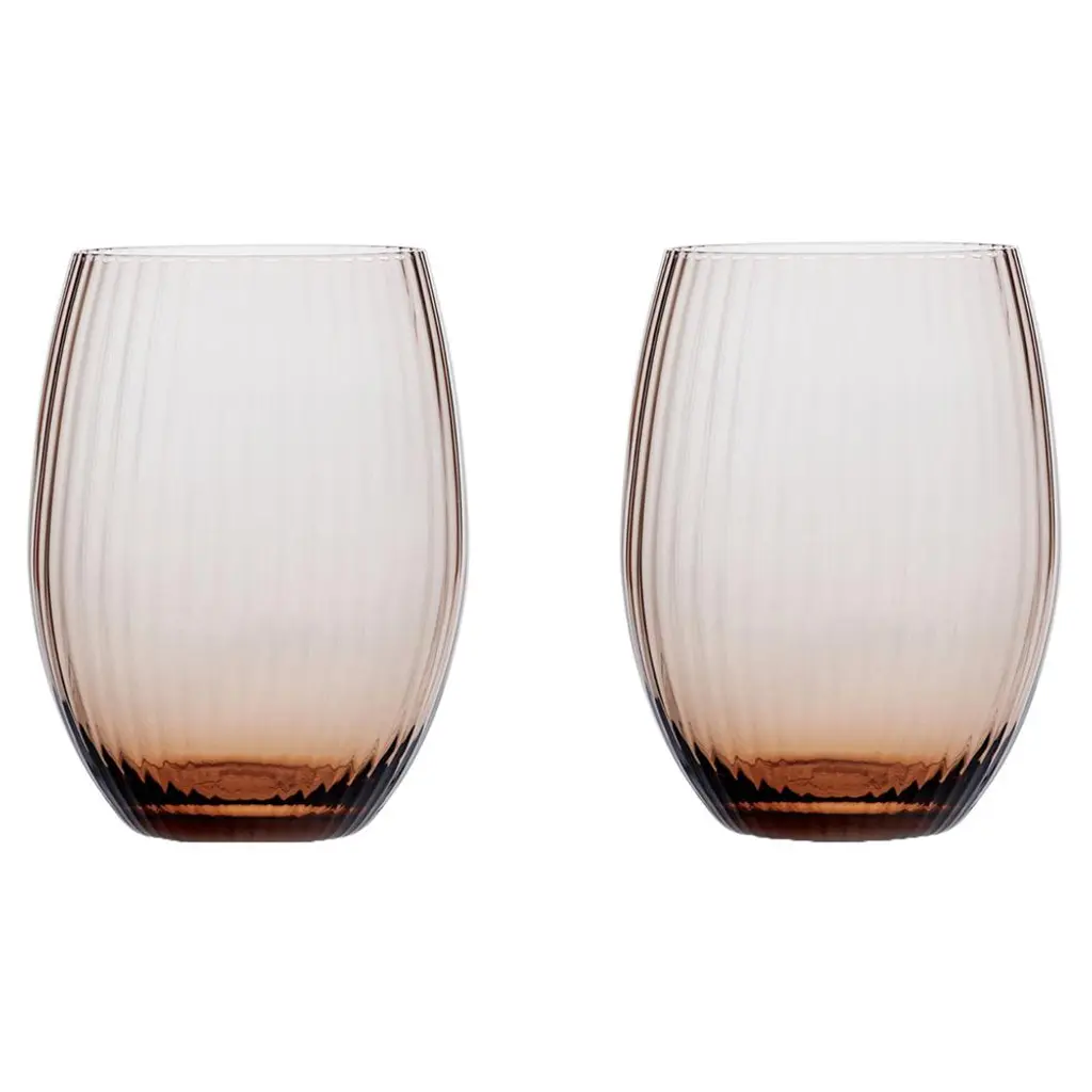 A masterful combination of harmonious lines enlivened by a delicate purple hue defines this set of two flared glass espresso cups with coordinated saucers. Both the cups and the saucers are embellished with a sophisticated iridescent finish, elegantly highlighted by the small ridges that enrich their texture. Dainty, smooth handles complete this exclusive set.