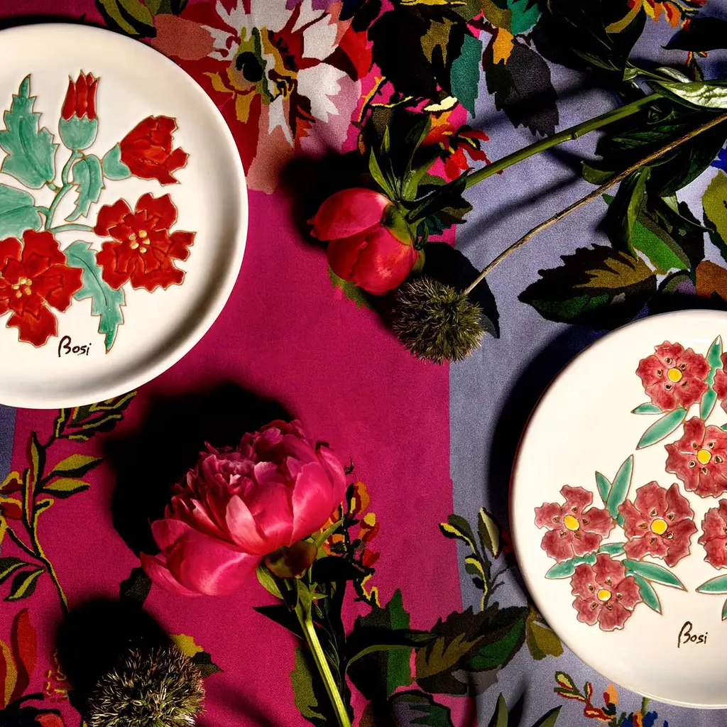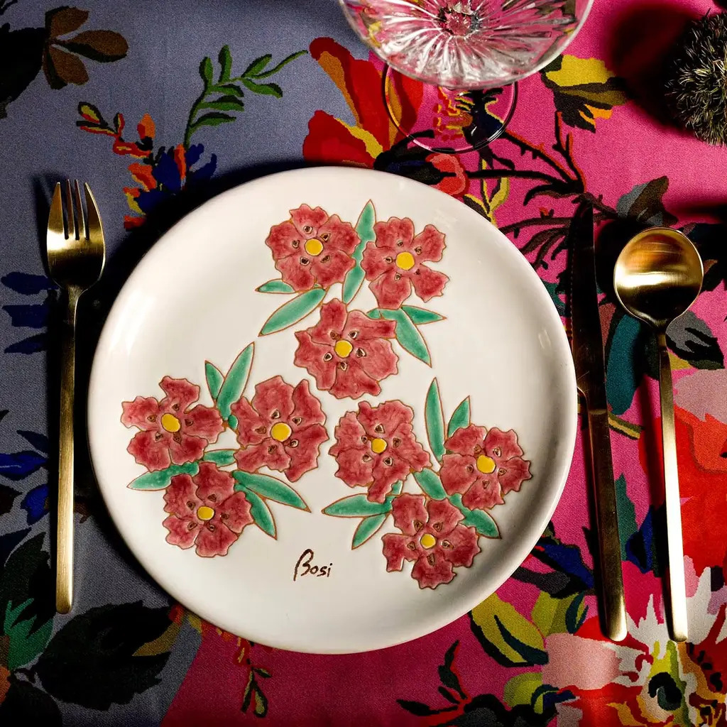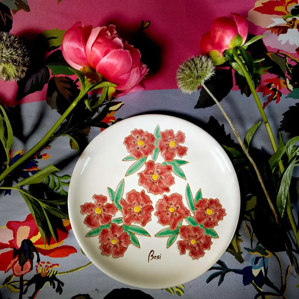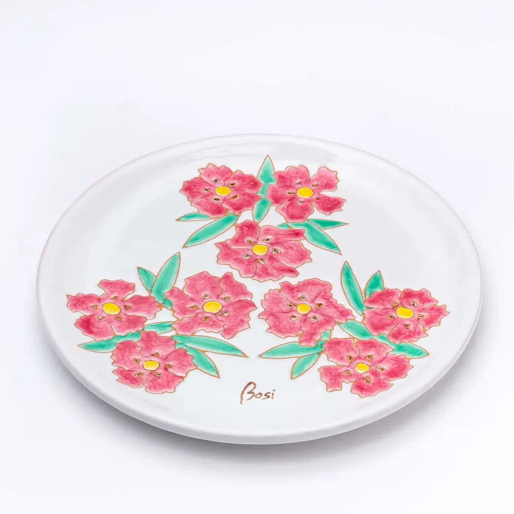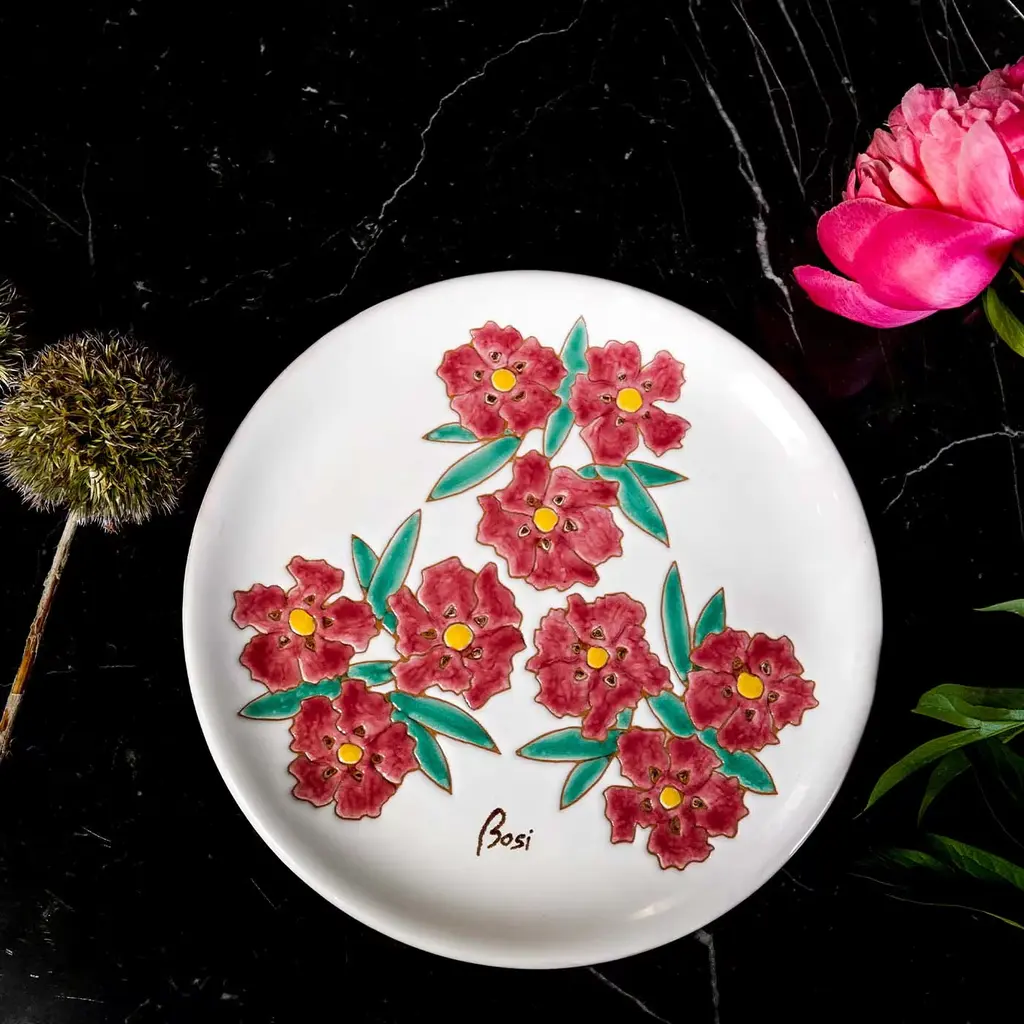 The poetic decoration of flowers and leaves engraved by hand onto this ceramic plate is so splendidly rendered that seemingly allows one to smell them. Painted by hand in green and dappled pink with yellow spots, it is set against a pure-white backdrop that lets the polychrome glazes stand out even more. It can be hung on walls or raised on pedestal bases for an equally delightful decorative statement.