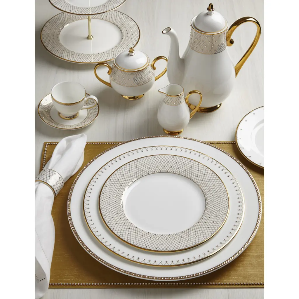Like the classic grace of a Royal wedding, Princess china is a fairy tale marriage of pure white china and sparkling crystals. A mix of stylish design and refined decor, simple gold or platinum lines provide a frame for a field of perfect gemstones. A truly one-of-a-kind statement, Prouna Jewelry china makes a great wedding gift, and is sure to become a prized family heirloom. Prouna Jewelry marries the beauty of fine bone china dinnerware with the sparkle of Swarovski Crystal Elements. Sculptural white china serves as an elegant base to hand-painted designs, gold and platinum ornamentation and dazzling arrays of Swarovski crystals. With several patterns to choose from, each with its own unique story, you're sure to find one you love. The crystals are attached with a special method that is tested dishwasher safe. A true marriage of technology and style, Prouna Jewelry Dinnerware is the height of luxury.