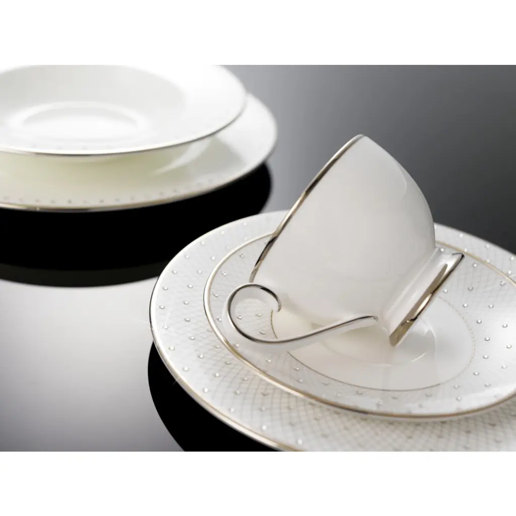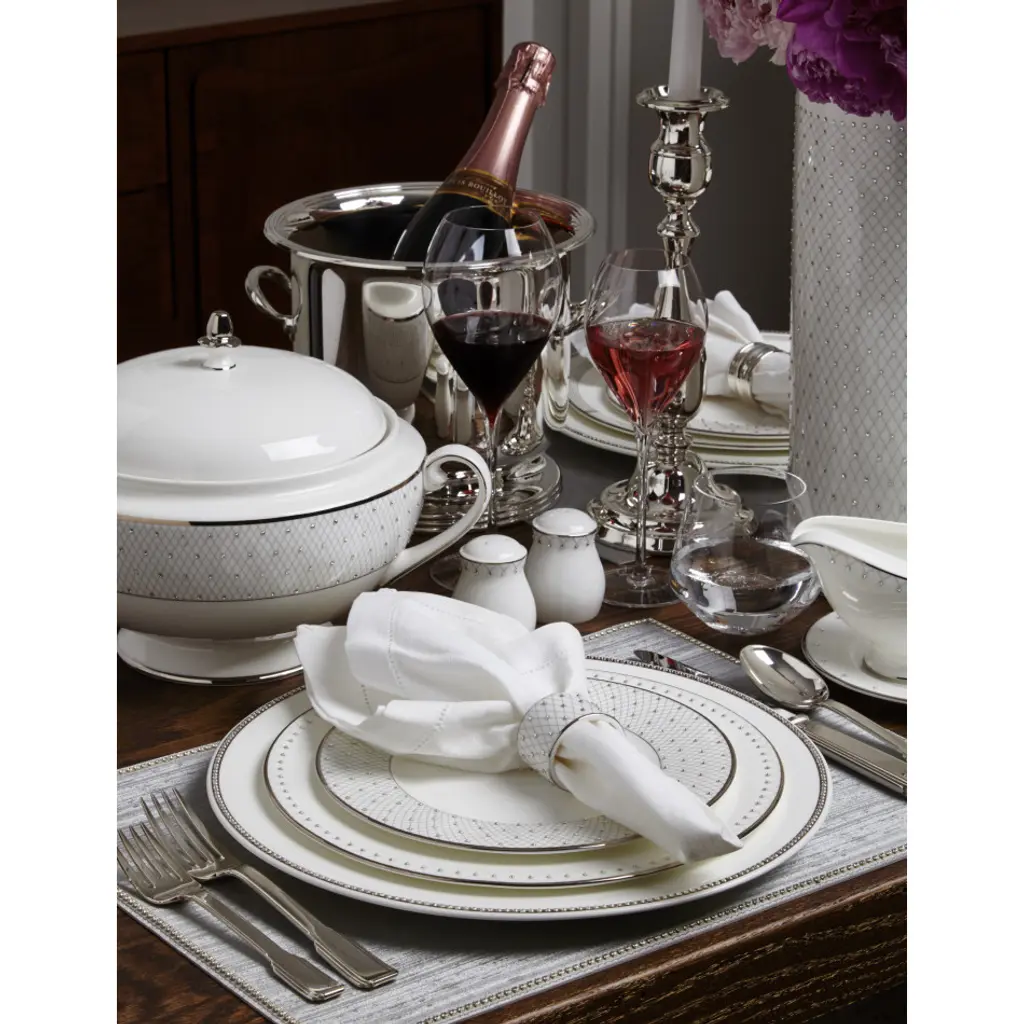 Like the classic grace of a Royal wedding, Princess china is a fairy tale marriage of pure white china and sparkling crystals. A mix of stylish design and refined decor, simple gold or platinum lines provide a frame for a field of perfect gemstones. A truly one-of-a-kind statement, Prouna Jewelry china makes a great wedding gift, and is sure to become a prized family heirloom. Prouna Jewelry marries the beauty of fine bone china dinnerware with the sparkle of Swarovski Crystal Elements. Sculptural white china serves as an elegant base to hand-painted designs, gold and platinum ornamentation and dazzling arrays of Swarovski crystals. With several patterns to choose from, each with its own unique story, you're sure to find one you love. The crystals are attached with a special method that is tested dishwasher safe. A true marriage of technology and style, Prouna Jewelry Dinnerware is the height of luxury.