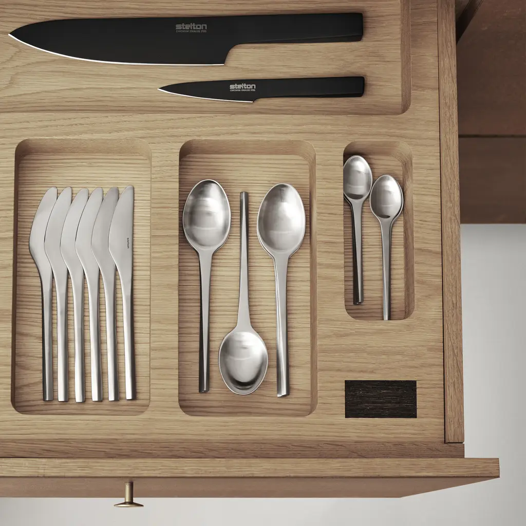 An award-winning design that dates back to 1960, but looks timeless. Made by Danish brand Stelton, the Prisme cutlery was designed by Jørgen Dahlerup and Gert Holbek. The set displays the very best of Scandinavian design. Refined and versatile at the same time, the Prisme cutlery set boasts elegantly simple lines that elevate ubiquitous tableware items to the tier of iconic designs. Tough thanks to their stainless steel material, the knives, forks, and spoons are meant to stand the passage of time and maintain their classic good-looks intact. After being discontinued, Stelton revived the Prisme set for a new generation of design lovers. Both 16pc and 24pc sets available.