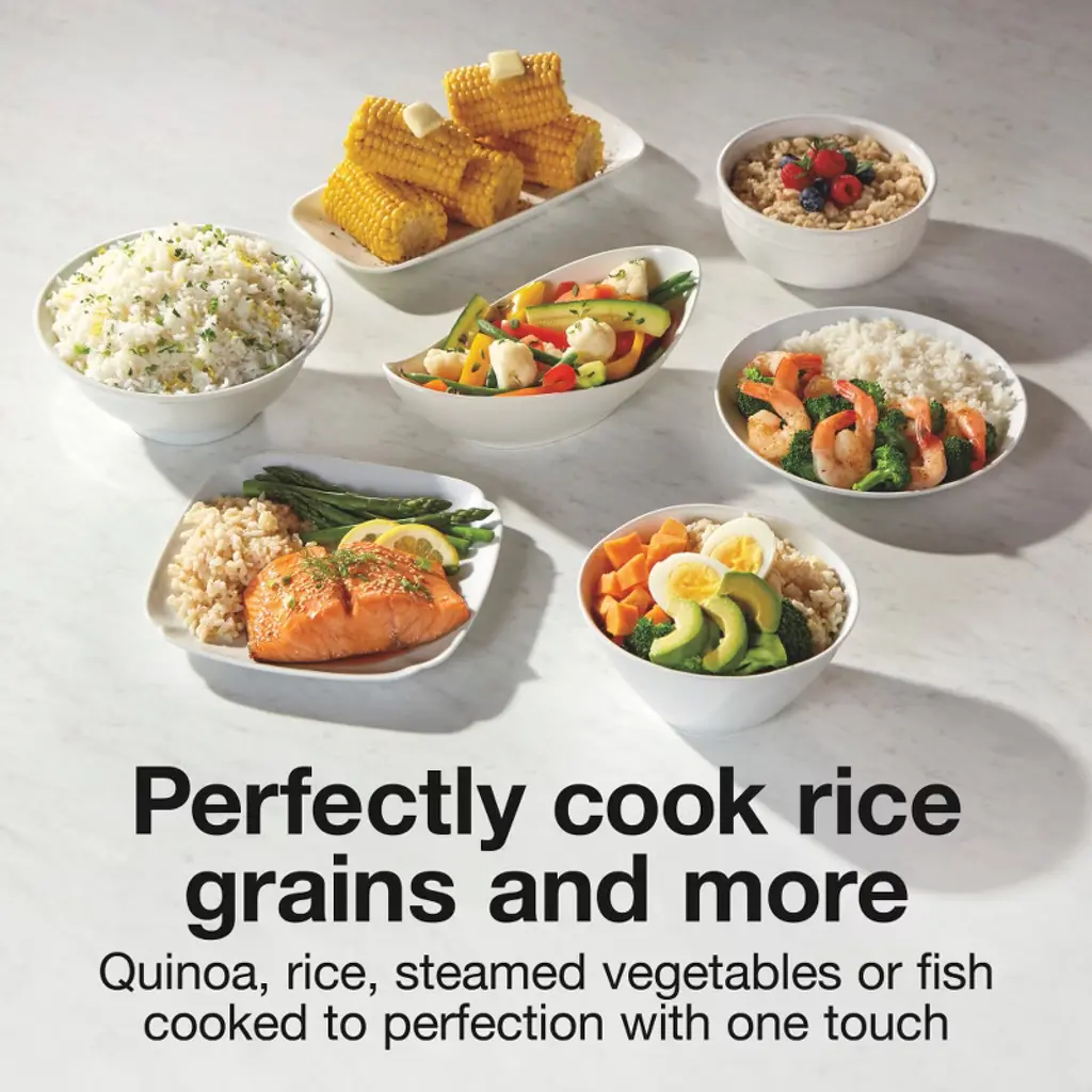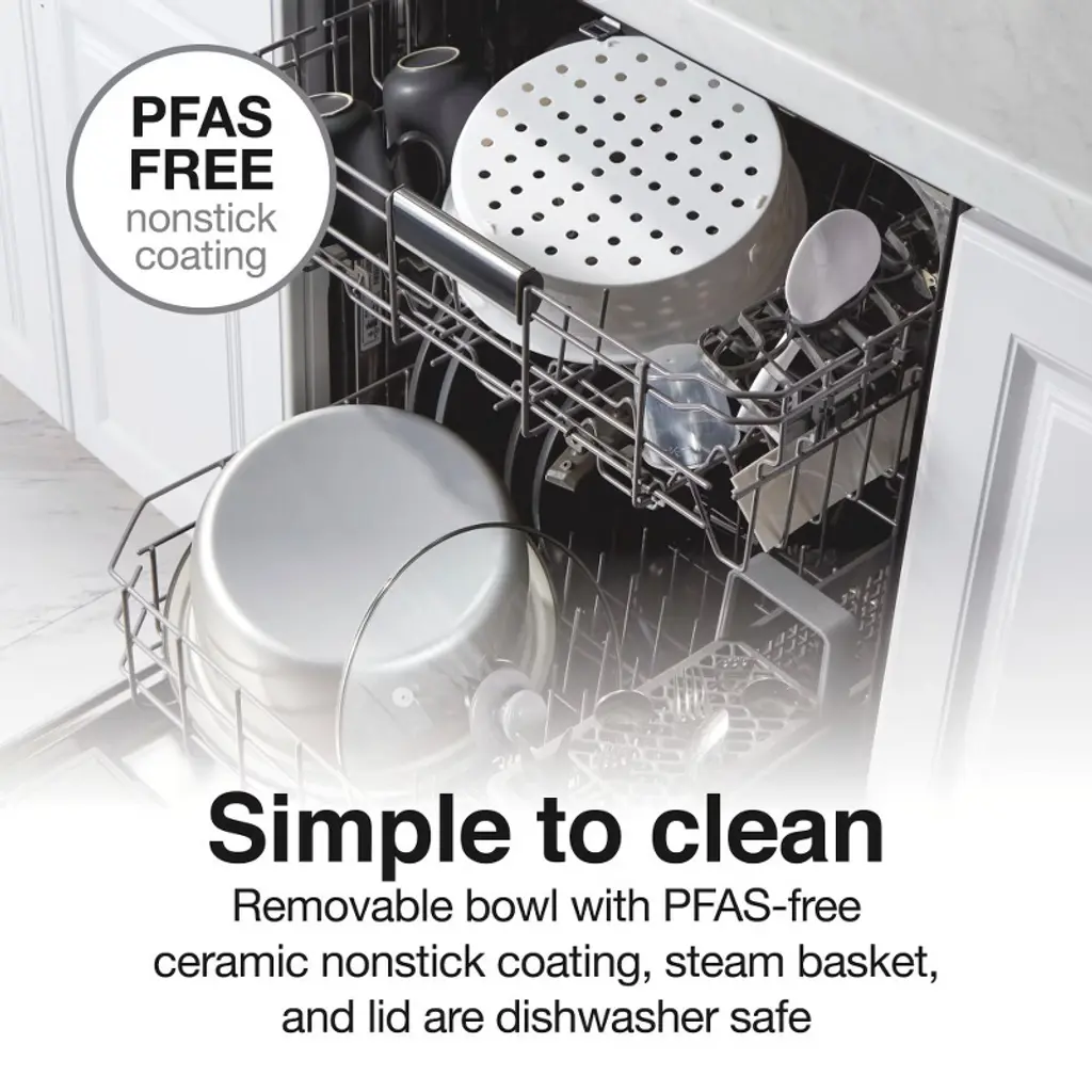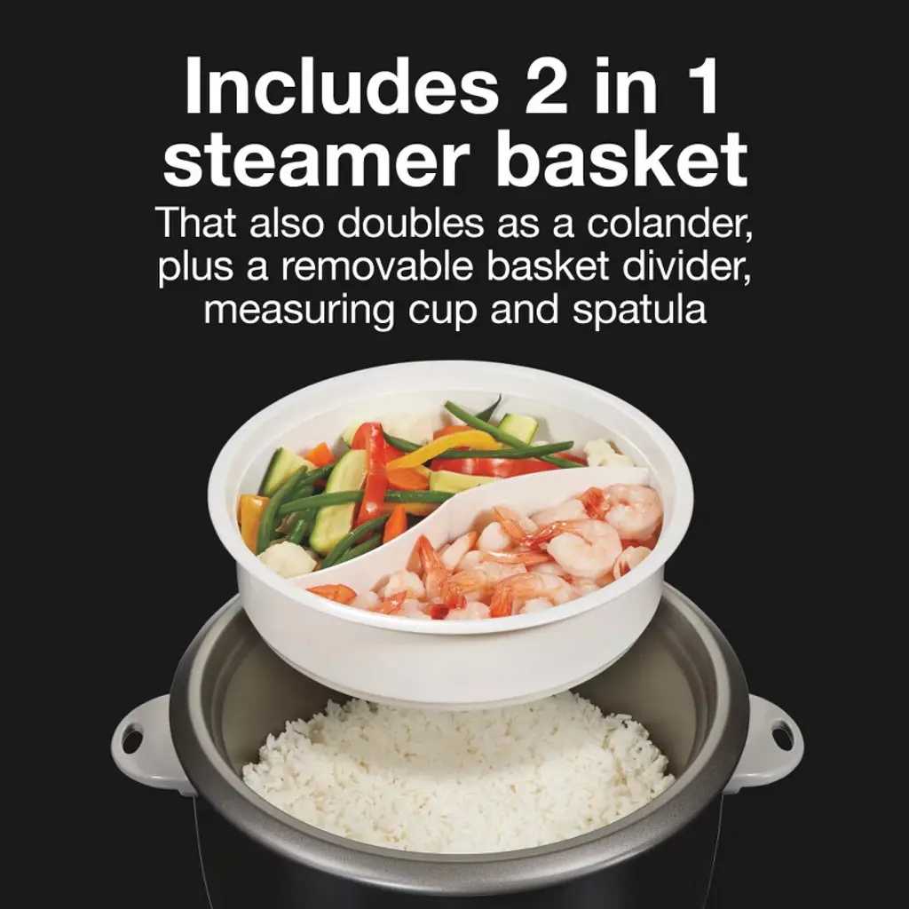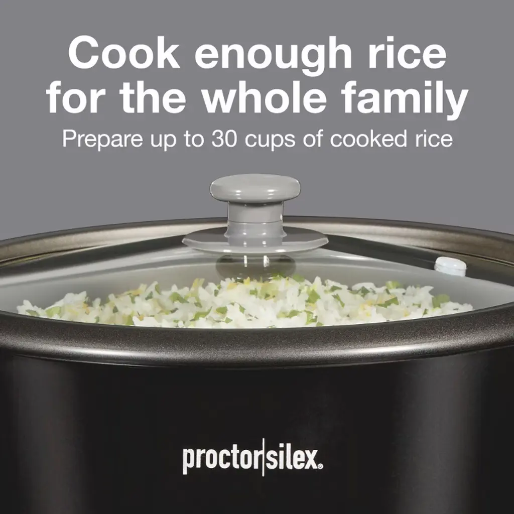 Perfectly cook your favorite rice and grains in the Proctor Silex® 30 Cup Rice Cooker & Steamer. Whether you're cooking oatmeal for breakfast, preparing a side of brown rice, or steaming vegetables and fish, you can do it all with the press of one button. The steamer basket on the cooker doubles as a colander for rinsing vegetables before cooking, or use it to steam everything from salmon to Brussels sprouts. The steamer basket has a removable divider so you can steam two foods at once while rice cooks. The extra-large-capacity rice cooker holds up to 30 cups of cooked or 15 cups of uncooked rice to easily feed a large family. No watching required. It cooks perfectly on its own, giving you time to prepare the rest of your meal, then it automatically switches to keep warm when cooking is complete. There’s no need to worry about boiling water, adjusting temperatures, or setting timers. Clean up is simple. The removable bowl with PFAS-free ceramic nonstick coating, steam basket, and lid are dishwasher safe. This rice cooker includes the 2 in 1 steamer basket, rice measuring cup and spatula. Backed by a 3 year limited warranty.