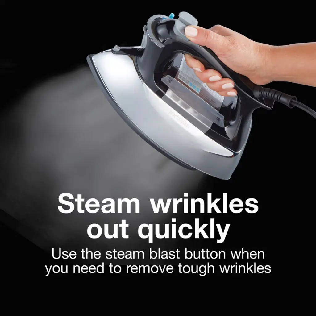 The Proctor Silex® Retro Iron has a nostalgic look and feel, yet delivers all the versatility and performance you'd expect from a modern iron. It features 7 temperature settings. Just turn the vintage-inspired dial to easily select the right temperature for a variety of different fabrics, ranging from linen to polyester. The iron is designed with a durable, nonstick soleplate that prevents fabrics from sticking, and chrome-plated steel construction for years of ironing. The steam blast button lets you blast steam from the soleplate to quickly remove wrinkles, even on thick, heavy garments. The anti-drip soleplate prevents water from dripping on clothing and eliminates mess. And the long 8 foot cord gives you plenty of reach, even when ironing long or oversized clothing and other items.