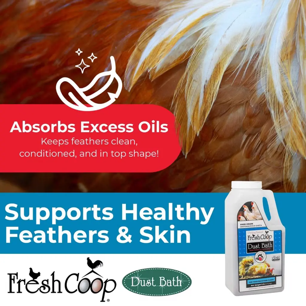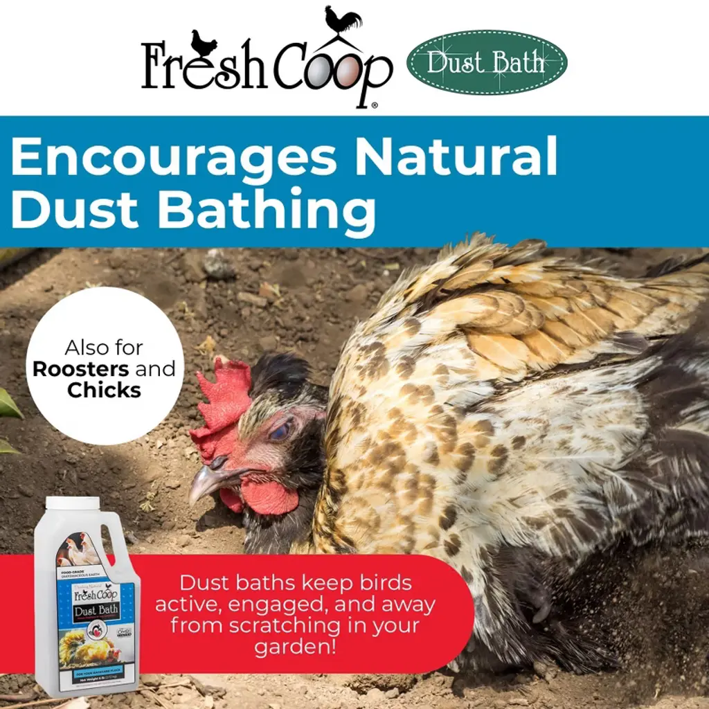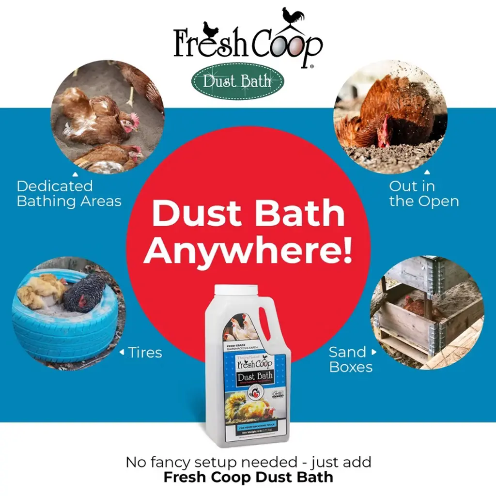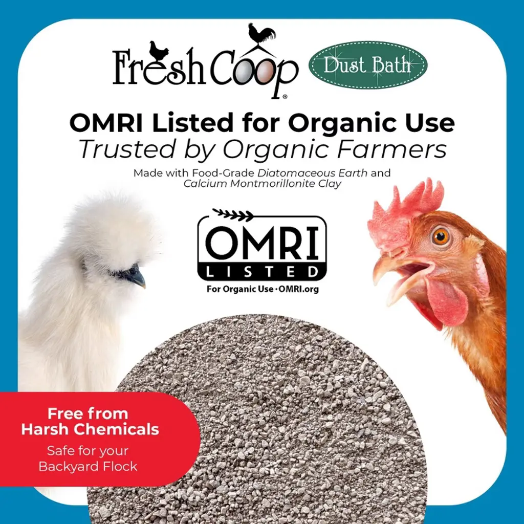 Give your flock the natural, healthy dust bath they need with Fresh Coop Dust Bath - a premium, food-grade naturally occurring blend of diatomaceous earth and calcium montmorillonite clay designed to absorb excess oils and keep feathers clean, conditioned, and in top shape. Encouraging natural dust bathing behavior, this essential poultry product supports daily preening, reduces boredom, and prevents destructive habits - keeping chickens active, engaged, and away from scratching in your garden! A proper dust bath helps maintain feather health, promotes social interactions, and ensures a stress-free environment for your birds. Designed for convenient use, Fresh Coop Dust Bath can be easily incorporated into dusting areas using litter pans, kiddie pools, old tires, or sandboxes, making it an adaptable solution for any flock setup. Fresh Coop Dust Bath is OMRI-Listed for organic use making it a number one choice for all organic farming practices.